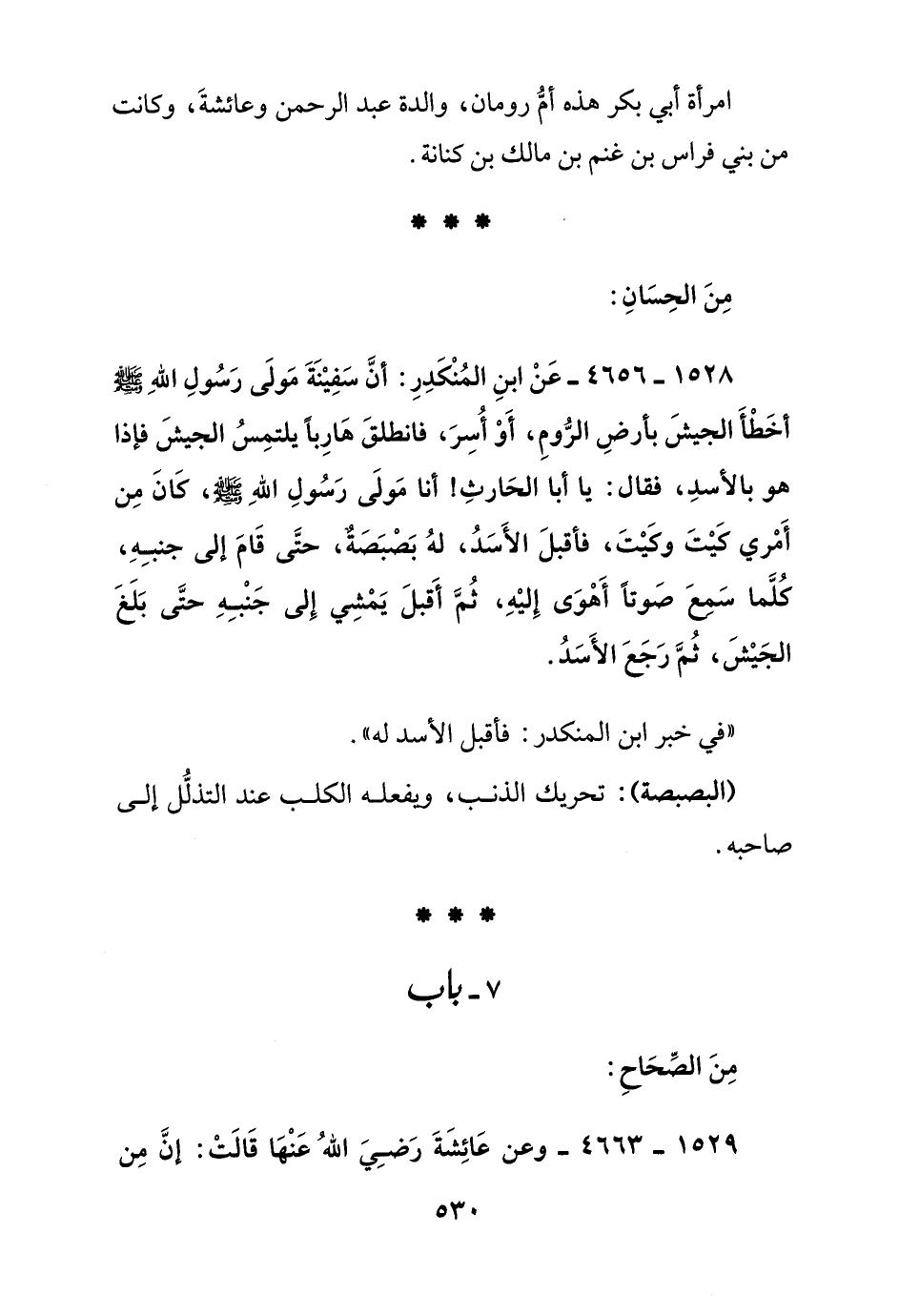 1528 - 4656 - عن ابن المنكدر: أن سفينة مولى رسول الله صلى الله عليه وسلم أخطأ الجيش بأرض الروم, أو أسر, فانطلق هاربا يلتمس الجيش فإذا هو بالأسد, فقال: يا أبا الحارث! أنا مولى رسول الله صلى الله عليه وسلم, كان من أمري كيت وكيت, فأقبل الأسد, له بصبصة, حتى قام إلى جنبه, كلما سمع صوتا أهوى إليه, ثم أقبل يمشي إلى جنبه حتى بلغ الجيش, ثم رجع الأسد"