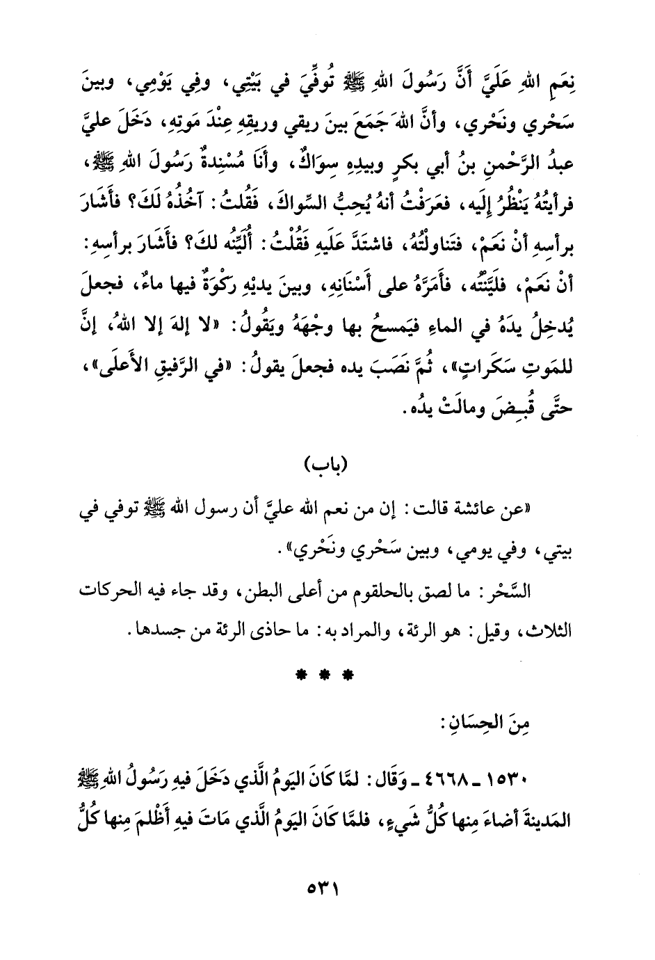 نعم الله على أن رسول الله صلى الله عليه وسلم توفي في بيتي, وفي يومي, وبين سحري ونحري, وأن الله جمع بين ريقي وريقه عند موته, دخل علي عبد الرحمن بن أبي بكر وبيده سواك, وأنا مسندة رسول الله صلى الله عليه وسلم, فرأيته ينظر إليه, فعرفت أنه يحب السواك, فقلت: آخذه لك؟ فأشار برأسه أن نعم, فتناولته, فاشتد عليه فقلت: ألينه لك؟ فأشار برأسه: أن نعم, فلينته, فأمره على أسنانه, وبين يديه ركوة فيها ماء, فجعل يدخل يده في الماء فيمسح بها وجهه ويقول: "لا إله إلا الله, إن للموت سكرات, ثم نصب يده فجعل يقول: "في الرفيق الأعلى" حتى قبض ومالت يده"