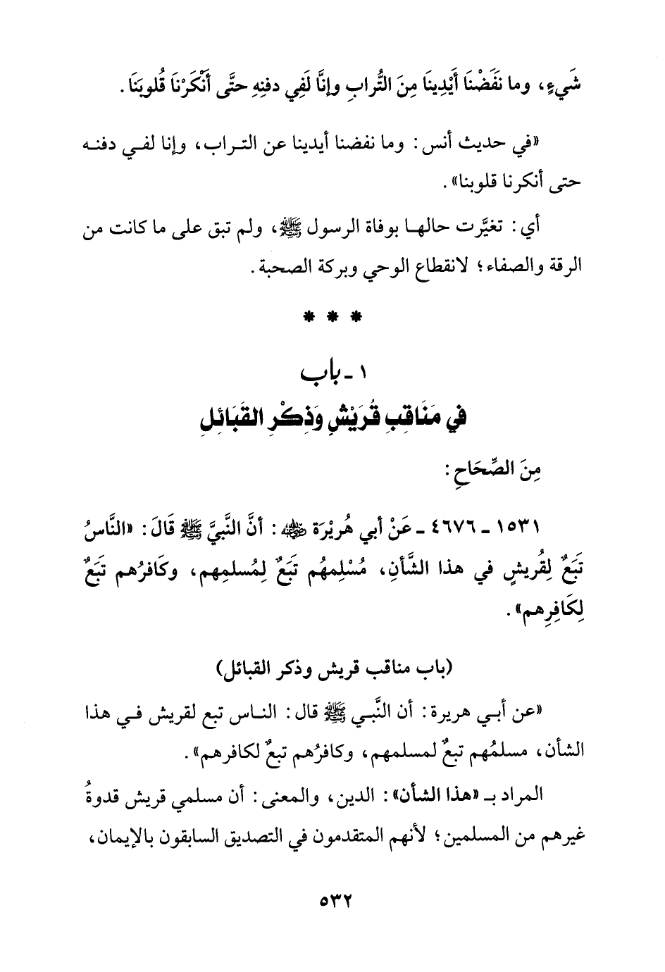 1531 - 4676 - عن أبي هريرة رضي الله عنه: أن النبي صلى الله عليه وسلم قال: "الناس تبع لقريش في هذا الشأن, مسلمهم تبع لمسلمهم, وكافرهم تبع لكافرهم"