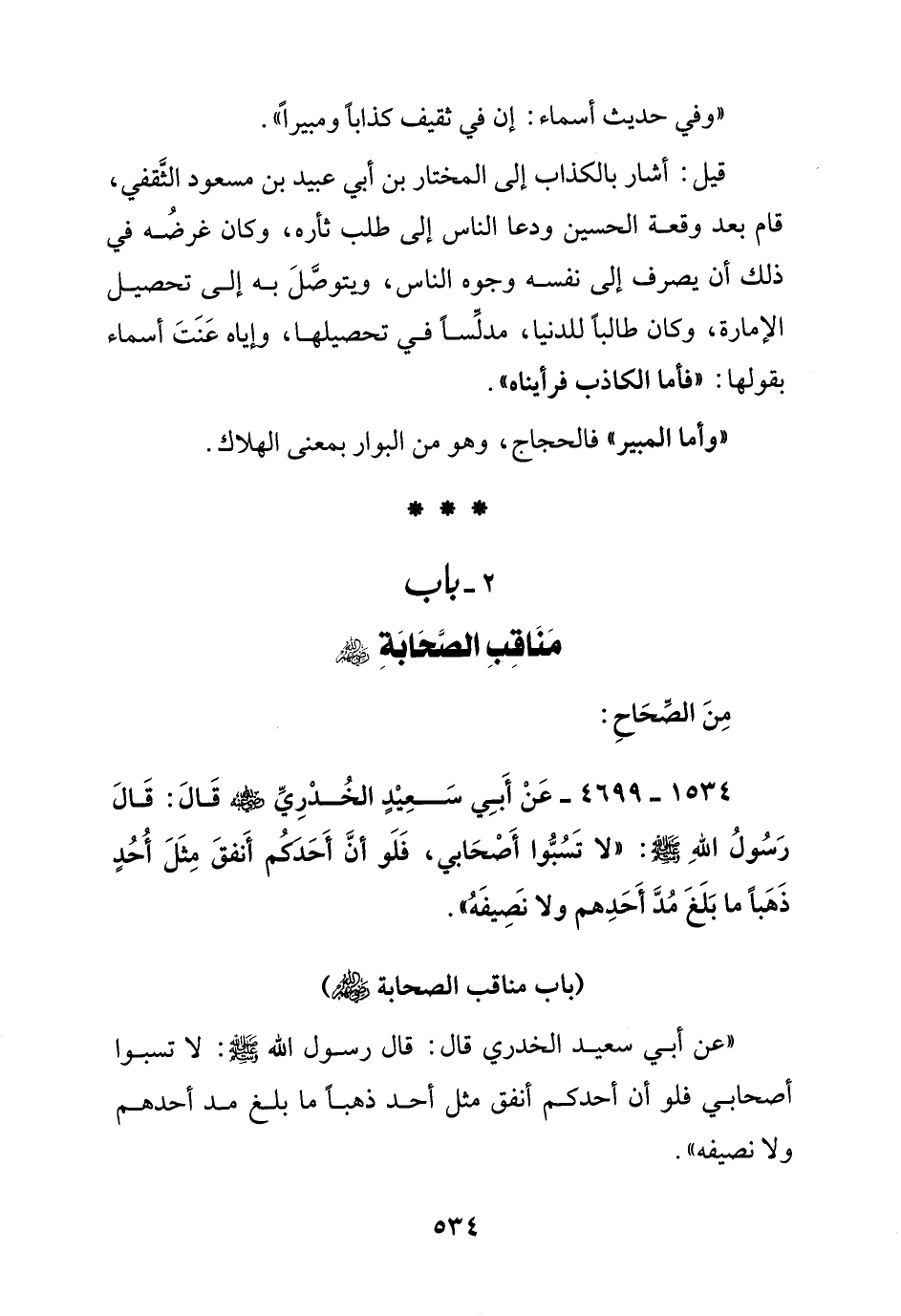 1534 - 4699 - عن أبي سعيد الخدري رضي الله عنه قال: قال رسول الله صلى الله عليه وسلم: "لا تسبوا أصحابي, فلو أن أحدكم أنفق مثل أحد ذهبا ما بلغ مد أحدهم ولا نصيفه"