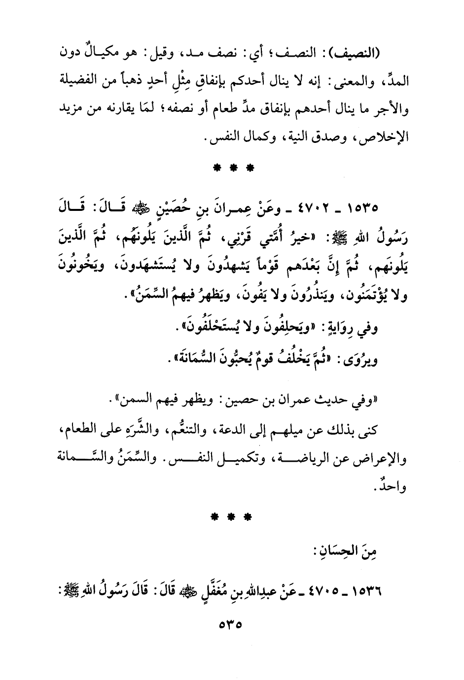 1535 - 4702 - وعن عمران بن حصين رضي الله عنه قال: قال رسول الله صلى الله عليه وسلم: "خير أمتي قرني, ثم الذين يلونهم, ثم الذين يلونهم, ثم إن بعدهم قوما يشهدون ولا يستشهدون, ويخونون ولا يؤمنون, وينذرون ولا يفون, ويظهر فيهم السمن"