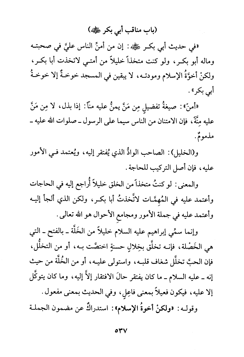 "وفي حديث أبي بكر رضي الله عنه: إن من أمن الناس علي في صحبته وماله أبي بكر, ولو كنت متخذا خليلا من أمتي لاتخذت أبا بكر, ولكن أخوة الإسلام ومودته, لا يبقين في المسجد خوخة إلا خوخة أبي بكر"