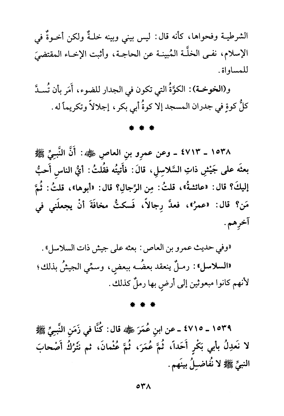1538 - 4713 - وعن عمرو بن العاص رضي الله عنه: أن النبي صلى الله عليه وسلم بعثه على جيش ذات السلاسل, قال: فأتيته فقلت: أي الناس أحب إليك؟ قال: "عائشة", قلت: من الرجال؟ قال: "أبوها", قلت: ثم من؟ قال: "عمر", فعد رجالا, فسكت مخافة أن يجعلني في آخرهم.