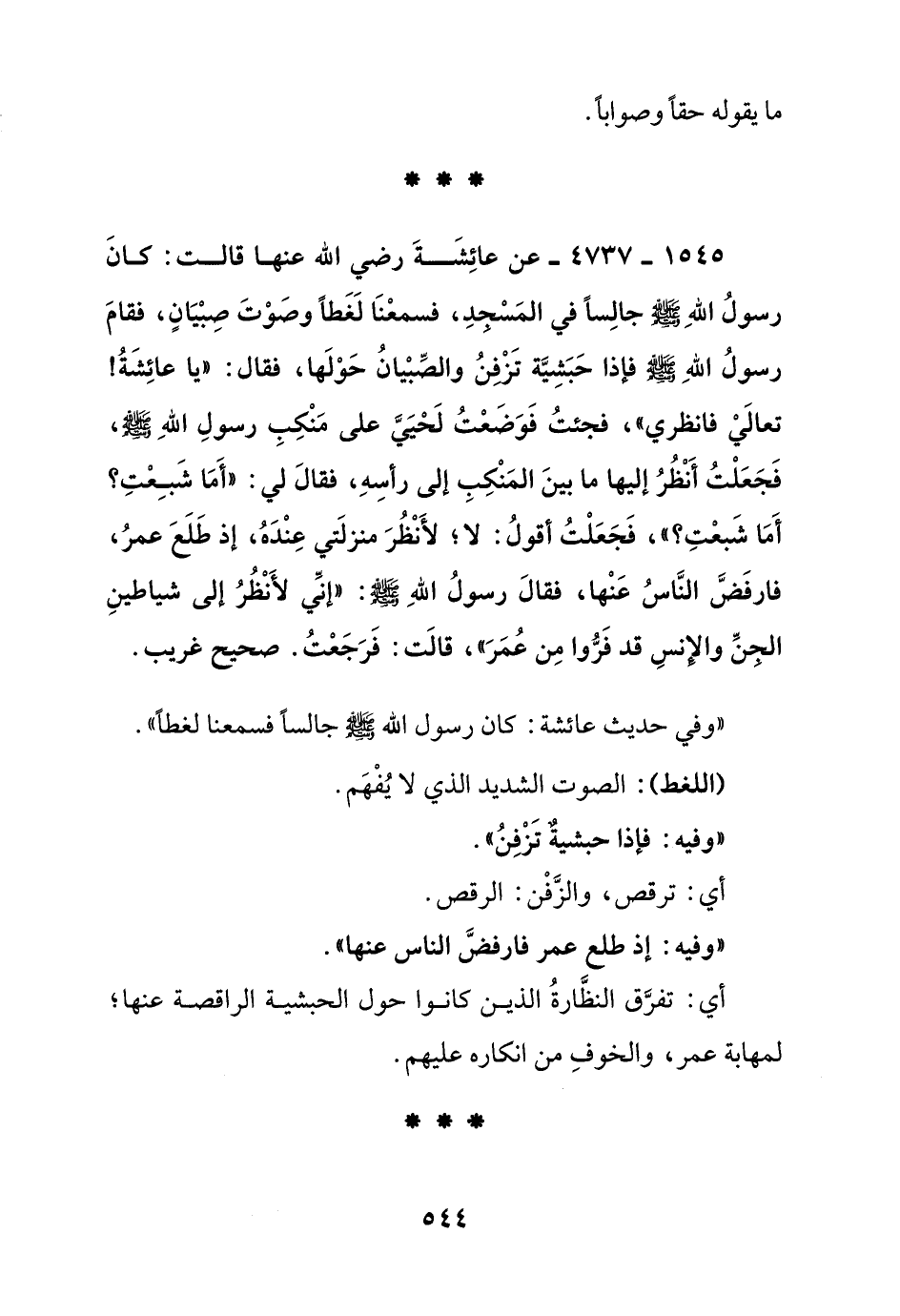 1545 - 4737 - عن عائشة رضي الله عنها قالت: كان رسول الله صلى الله عليه وسلم جالسا في المسجد, فسمعنا لغطا وصوت صبيان, فقام رسول الله صلى الله عليه وسلم فإذا حبشية تزفن والصبيان حولها, فقال: "يا عائشة! تعالى فانظري", فجئت فوضعت لحيي على منكب رسول الله صلى الله عليه وسلم, فجعلت أنظر إليها ما بين المنكب إلى رأسه, فقال لي: "أما سمعت؟ أما شبعت؟ " فجعلت أقول: لا, لأنظر منزلتي عنده, إذ طلع عمر, فارفض الناس عنها, فقال رسول الله صلى الله عليه وسلم: "إني لأنظر إلى شياطين الجن والإنس قد فروا من عمر" قالت: فرجعت. صحيح غريب.