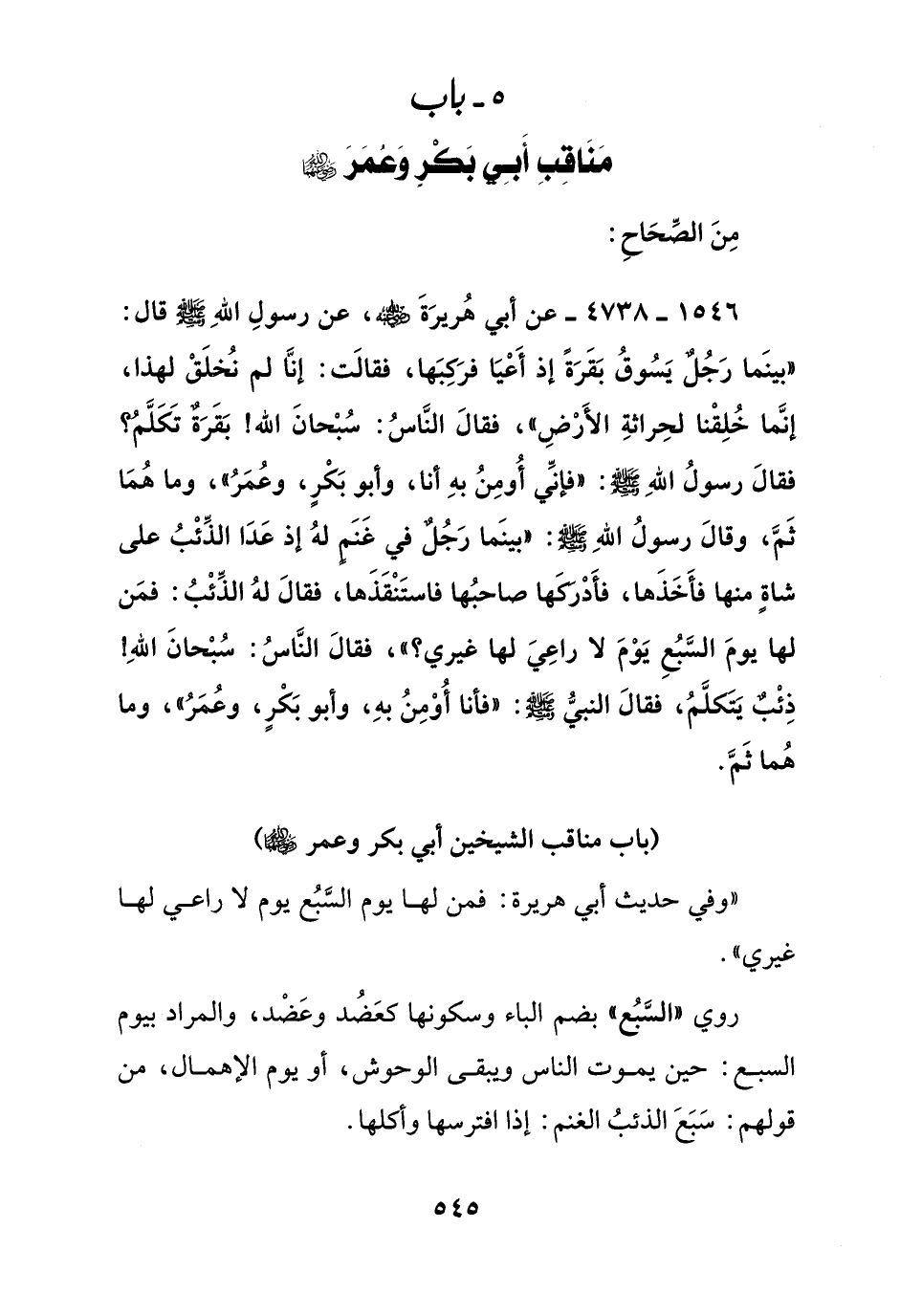 1546 - 4738 - عن أبي هريرة رضي الله عنه, عن رسول الله صلى الله عليه وسلم قال: "بينما رجل يسوق بقرة إذ أعيا فركبها, فقالت: إنا لم نخلق لهذا, إنما خلقنا لحراثة الأرض, فقال الناس: سبحان الله! بقرة تتكلم؟ فقال رسول الله صلى الله عليه وسلم: "فإني أومن به أنا, وأبو بكر, وعمر", وما هما ثم, وقال رسول الله صلى الله عليه وسلم: "بينما رجل في غنم له إذ عدا الذئب على شاة منها فأخذها, فأدركها صاحبها فاستنقذها, فقال له الذئب: فمن لها يوم السبع يوم لا راعي لها غيري؟ ", فقال الناس: سبحان الله! ذئب يتكلم, فقال النبي صلى الله عليه وسلم: "فأنا أومن به, وأبو بكر, وعمر", وما هما ثم.
