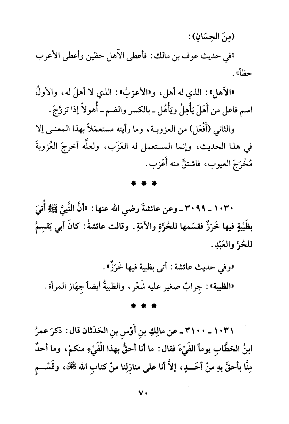 1031 - 3100 - عن مالك بن أوس بن الحدثان قال: ذكر عمر ابن الخطاب يوما الفيء فقال: ما أنا أحق بهذا الفيء منكم, وما أحد منا بأحق به من أحد, إلا أنا على منازلنا من كتاب الله - عز وجل - , وقسم