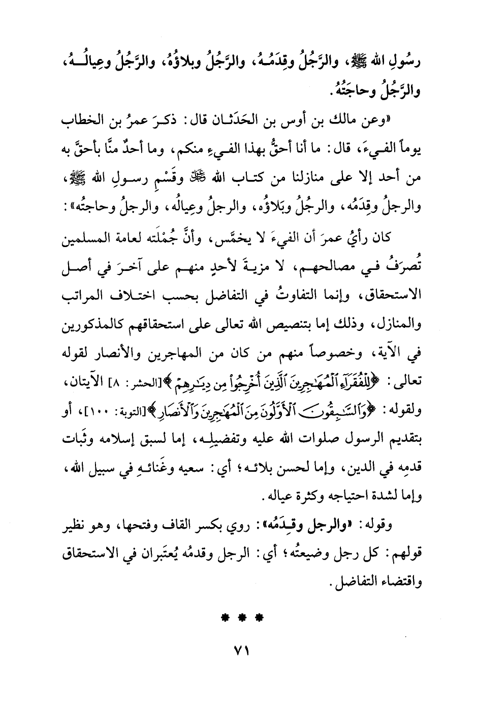 "وعن مالك بن أوس بن الحدثان قال: ذكر عمر بن الخطاب يوما الفيء, قال: ما أنا أحق بهذا الفيء منكم, وما أحد منا بأحق به من أحد إلا على منازلنا من كتاب الله - عز وجل - وقسم رسول الله صلى الله عليه وسلم, والرجل وقدمه, والرجل وبلاؤه,, والرجل وعياله, والرجل وحاجته"