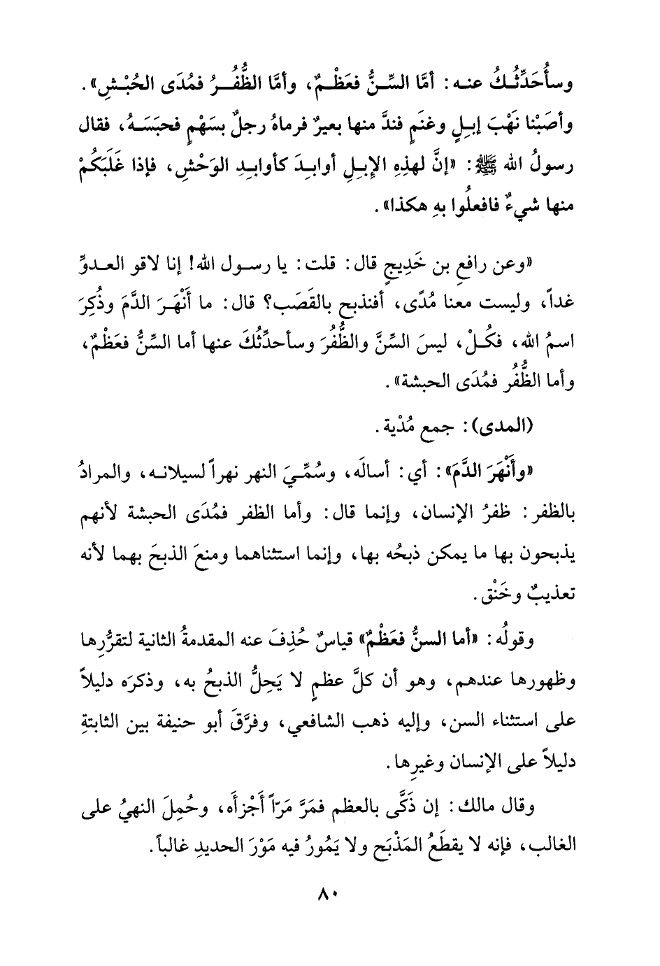 وسأحدثك عنه: أما السن فعظم, وأما الظفر فمدى الحبش" وأصبنا نهب إبل وغنم فند منها بعير فرماه رجل بسهم فحبسه, فقال رسول الله صلى الله عليه وسلم: "إن لهذه الإبل أوابد كأوابد الوحش, فإذا غلبكم منها شيء فافعلوا به هكذا"