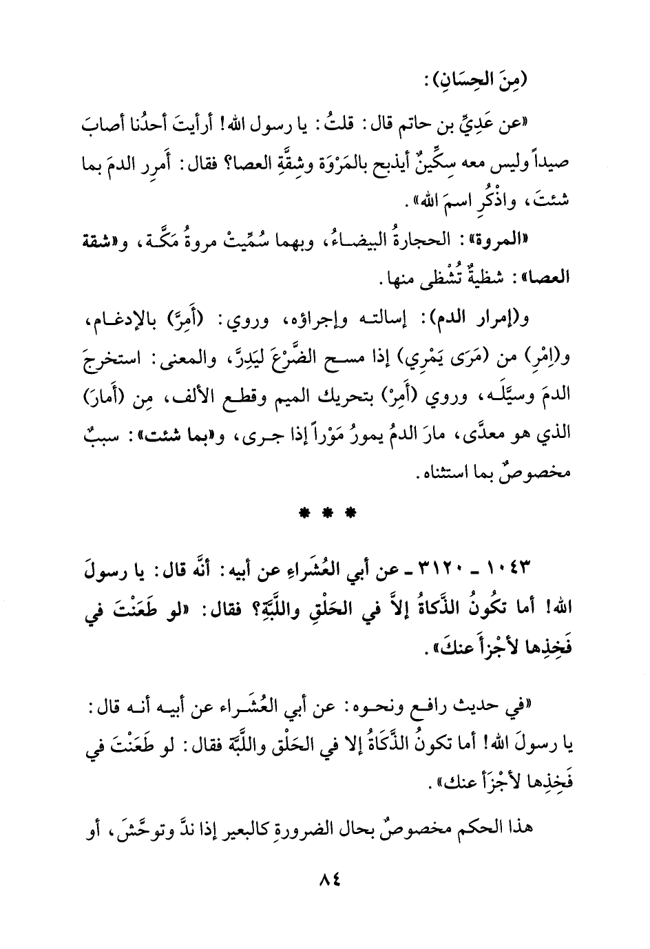 1043 – 3120 – عن أبي العشراء عن أبيه: أنه قال: يا رسول الله! أما تكون الذكاة إلا في الحلق واللبة؟ فقال: "لو طعنت في فخذها لأجزأ عنك"