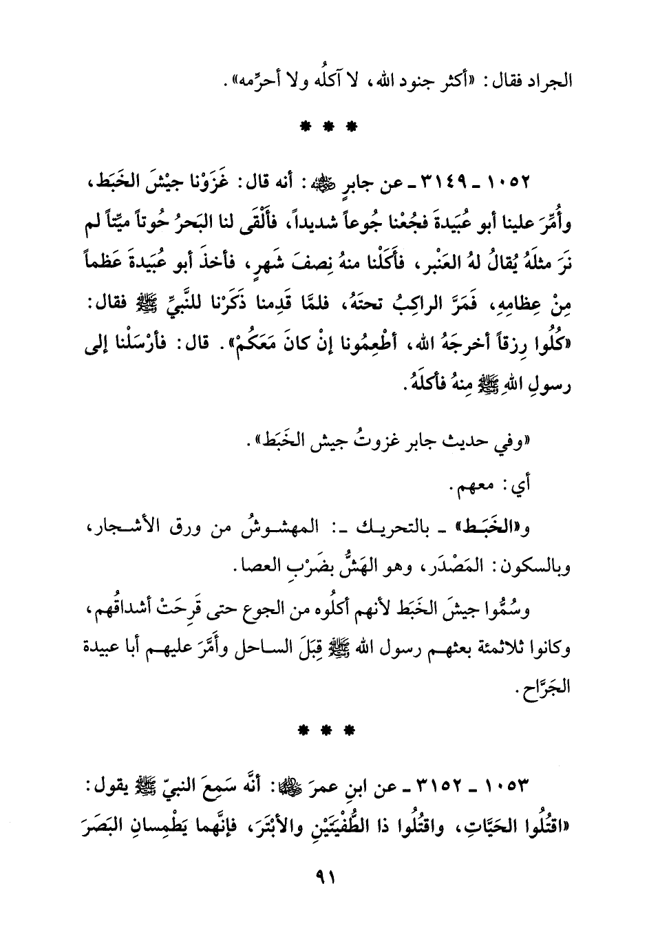 1052 - 3149 - عن جابر رضي الله عنه: أنه قال: غزونا جيش الخبط, وأمر علينا أبو عبيدة فجعنا جوعا شديدا, فألقى لنا البحر حوتا ميتا لم نر مثله يقال له العنبر, فأكلنا منه نصف شهر, فأخذ أبو عبيدة عظما من عظامه, فمر الراكب تحته, فلما قدمنا ذكرنا للنبي صلى الله عليه وسلم فقال: "كلوا رزقا أخرجه الله, أطعمونا إن كان معكم" قال: فأرسلنا إلى رسول الله صلى الله عليه وسلم منه فأكله"
