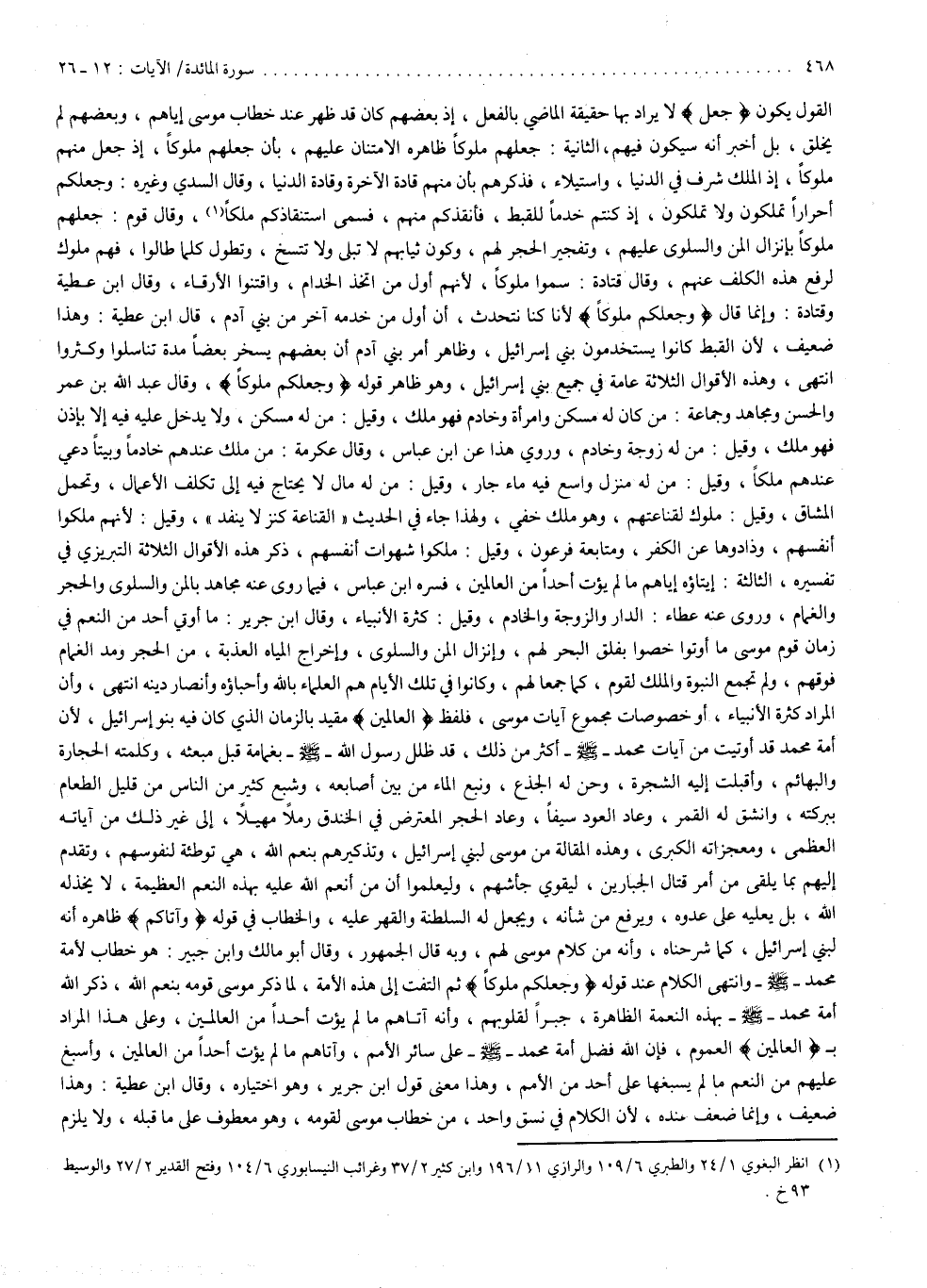 القول يكون جعل لا يراد بها حقيقة الماضي بالفعل ، إذ بعضهم كان قد ظهر عند خطاب موسى إياهم ، وبعضهم لم يخلق بل أخبر أنه سيكون فيهم . الثانية : جعلهم ملوكاً ظاهره الامتنان عليهم بأن جعلهم ملوكاً إذ جعل منهم ملوكاً ، إذ الملك شرف في الدنيا واستيلاء ، فذكرهم بأن منهم قادة الآخرة وقادة الدنيا . وقال السدي وغيره : وجعلكم أحراراً تملكون ولا تملكون ، إذ كنتم خدماً للقبط فأنقذكم منهم ، فسمي استنقاذكم ملكاً . وقال قوم : جعلهم ملوكاً بإنزال المن والسلوى عليهم وتفجير الحجر لهم ، وكون ثيابهم لا تبلى ولا تنسخ وتطول كلما طالوا ، فهم ملوك لرفع هذه الكلف عنهم . وقال قتادة : ملوكاً لأنهم أول من اتخذ الخدام واقتنوا الأرقاء . وقال ابن عطية وقتادة : وإنما قال وجعلكم ملوكاً ، لأنا كنا نتحدث أن أول من خدمه آخر من بني آدم . قال ابن عطية : وهذا ضعيف ، لأن القبط كانوا يستخدمون بني إسرائيل . وظاهر أمر بني آدم أن بعضهم يسخر بعضاً مدة تناسلوا وكثروا انتهى .