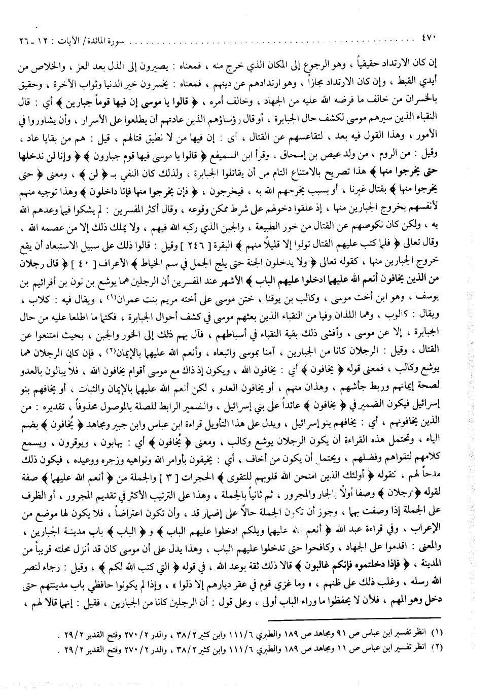 ( قَالَ رَجُلاَنِ مِنَ الَّذِينَ يَخَافُونَ أَنْعَمَ اللَّهُ عَلَيْهِمَا ادْخُلُواْ عَلَيْهِمُ الْبَابَ ( الأشهر عند المفسرين أنّ الرجلين هما يوشع بن نون بن افراثيم بن يوسف وهو ابن أخت موسى ، وكالب بن يوقنا ختن موسى على أخته مريم بنت عمران ويقال فيه : كلاب ، ويقال : كالوب ، وهما اللذان وفيا من النقباء الذين بعثهم موسى في كشف أحوال الجبابرة فكتما ما اطلعا عليه من حال الجبابرة إلا عن موسى ، وأفشى ذلك بقية النقباء في أسباطهم فآل بهم ذلك إلى الخور والجبن بحيث امتنعوا عن القتال . وقيل : الرجلان كانا من الجبارين آمنا بموسى واتبعاه ، وأنعم الله عليهما بالإيمان . فإن كان الرجلان هما يوشع وكالب فمعنى قوله : يخافون ، أي : يخافون الله ، ويكون إذ ذاك مع موسى أقوام يخافون الله فلا يبالون بالعدو لصحة إيمانهم وربط جأشهم ، وهذان منهم . أو يخافون العدو ، ولكن أنعم الله عليهما بالإيمان والثبات ، أو يخافهم بنو إسرائيل فيكون الضمير في يخافون عائداً على بني إسرائيل ، والضمير الرابط للصلة بالموصول محذوفاً تقديره : من الذين يخافونهم أي : يخافهم بنو إسرائيل . ويدل على هذا التأويل قراءة ابن عباس ، وابن جبير ، ومجاهد ، يخافون بضم الياء . وتحتمل هذه القراءة أن يكون الرجلان يوشع وكالب . ومعنى يخافون أي : يهابون ويوقرون ويسمع كلامهم لتقواهم وفضلهم ، ويحتمل أن يكون من أخاف أي يخيفون : بأوامر الله ونواهيه وزجره ووعيده ، فيكون ذلك مدحاً لهم كقوله ) أُوْلَئِكَ الَّذِينَ امْتَحَنَ اللَّهُ قُلُوبَهُمْ لِلتَّقْوَى ( والجملة من أنعم الله عليهما صفة لقوله : رجلان ، وصفا أولاً بالجار والمجرور ، ثم ثانياً بالملة . وهذا على الترتيب الأكثر في تقديم المجرور أو الظرف على الجملة إذا وصفت بهما ، وجوز أن تكون الجملة حالاً على إضمار قد ، وأن تكون اعتراضاً ، فلا يكون لها موضع من الإعراب . وفي قراءة عبد الله . أنعم الله عليهما ويلكم ادخلوا عليهم الباب . والباب : باب مدينة الجبارين ، والمعنى : اقدموا على الجهاد وكافحوا حتى تدخلوا عليهم الباب ، وهذا يدل على أنّ موسى كان قد أنزل محلته قريباً من المدينة .