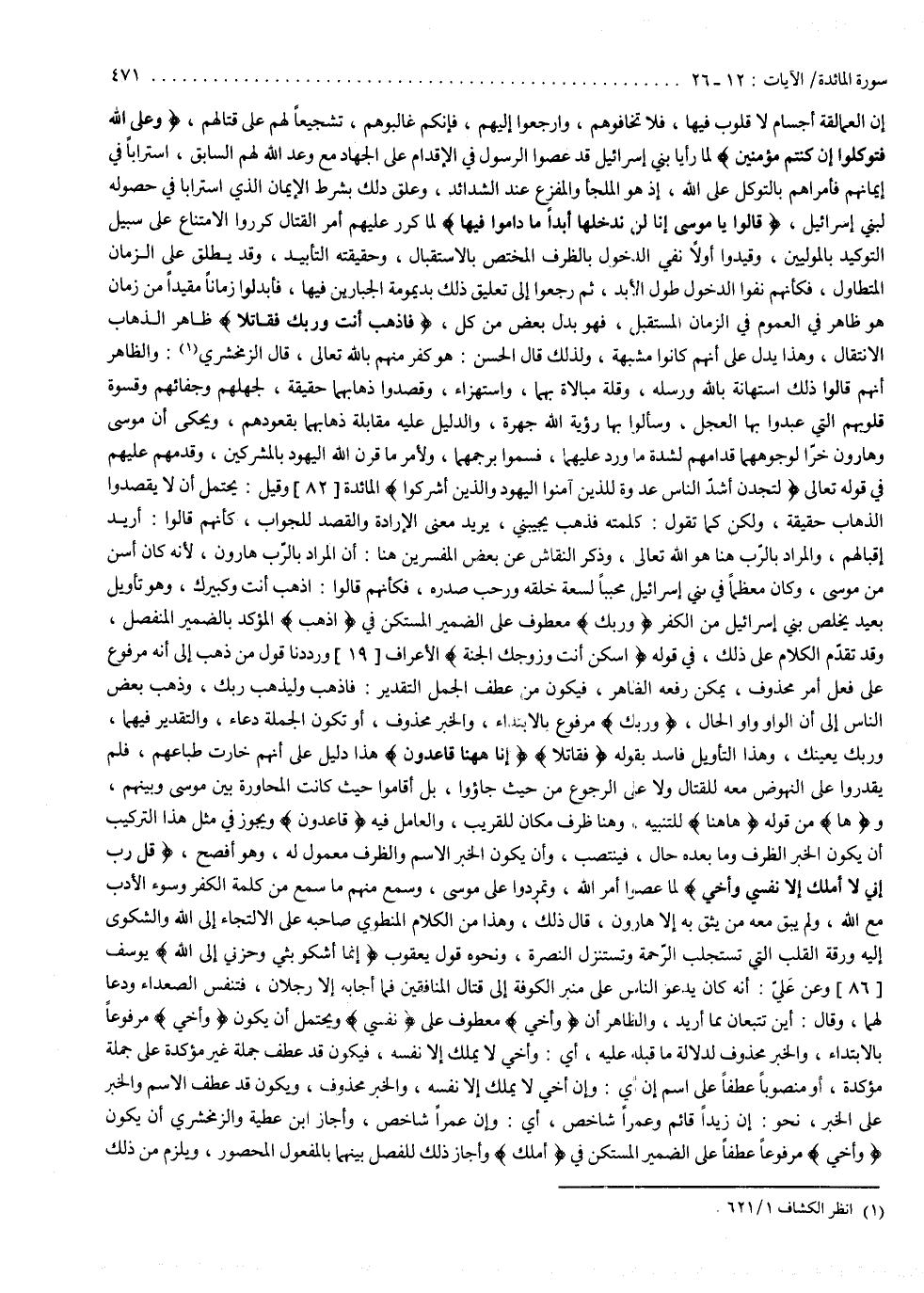 ( فَاذْهَبْ أَنتَ وَرَبُّكَ فَقَاتِلا ( ظاهر الذهاب الانتقال ، وهذا يدل على أنهم كانوا مشبهة ، ولذلك قال الحسن : هو كفر منهم بالله تعالى . قال الزمخشري : والظاهر أنهم قالوا ذلك استهانة بالله ورسله وقلة مبالاة بهما واستهزاء ، وقصدوا ذهابهما حقيقة لجهلهم وجفائهم وقسوة قلوبهم التي عبدوا بها العجل ، وسألوا بها رؤية الله جهرة ، والدليل عليه مقابلة ذهابهما بقعودهم . ويحكى أنّ موسى وهارون خرّا لوجوههما ما قدامهم لشدة ما ورد عليهما فسموا برجمهما ، ولأمر ما قرن الله اليهود بالمشركين وقدمهم عليهم في قوله تعالى : ) لَتَجِدَنَّ أَشَدَّ النَّاسِ عَدَاوَةً لّلَّذِينَ ءامَنُواْ الْيَهُودَ وَالَّذِينَ أَشْرَكُواْ ( وقيل : يحتمل أن لا يقصدوا الذهاب حقيقة ، ولكن كما تقول : كلمته فذهب يجبيني ، يريد معنى الإرادة والقصد للجواب ، كأنهم قالوا : اريد إقبالهم .