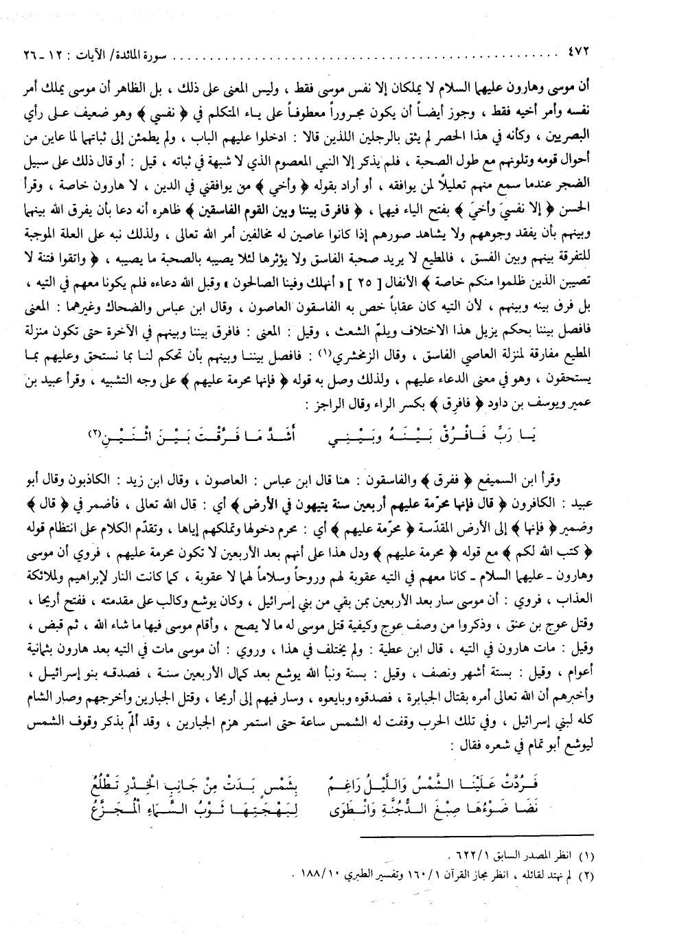 ( فَافْرُقْ بَيْنَنَا وَبَيْنَ الْقَوْمِ الْفَاسِقِينَ ( ظاهره أنه دعا بأن يفرق الله بينهما وبينهم بأن يفقد وجوههم ولا يشاهد صورهم إذا كانوا عاصين له مخالفين أمر الله تعالى ، ولذلك نبه على العلة الموجبة للتفرقة بينهم وبين الفسق فالمطيع لا يريد صحبة الفاسق ولا يؤثرها لئلا يصيبه بالصحبة ما يصيبه ، ( وَاتَّقُواْ فِتْنَةً لاَّ تُصِيبَنَّ الَّذِينَ ظَلَمُواْ مِنكُمْ خَاصَّةً ( ) يَرِثُهَا عِبَادِىَ الصَّالِحُونَ ( وقبل الله دعاءه فلم يكونا معهم في التيه ، بل فرق بينه وبينهم ، لأن التيه كان عقاباً خص به الفاسقون العاصون . وقال ابن عباس والضحاك وغيرهما : المعنى فافصل بيننا بحكم يزيل هذا الاختلاف ويلمّ الشعث . وقيل : المعنى فافرق بيننا وبينهم في الآخرة حتى تكون منزلة المطيع مفارقة لمنزلة العاصي الفاسق . وقال الزمخشري : فافصل بيننا وبينهم بأن تحكم لنا بما نستحق ، وعليهم بما يستحقون ، وهو في معنى الدعاء عليهم ، ولذلك وصل به قوله : فإنها محرمة عليهم ، على وجه التشبيه . وقرأ عبيد بن عمير ويوسف بن داود : فافرِق بكسر الراء وقال الراجز : يا رب فافرق بينه وبيني