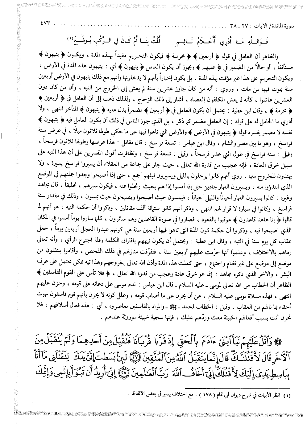 والظاهر أن العامل في قوله : أربعين محرمة ، فيكون التحريم مقيداً بهذه المدة ، ويكون يتيهون مستأنفاً أو حالاً من الضمير في عليهم . ويجوز أن يكون العامل يتيهون أي : يتيهون هذه المدة في الأرض ، ويكون التحريم على هذا غير مؤقت بهذه المدة ، بل يكون إخباراً بأنهم لا يدخلونها ، وأنهم مع ذلك يتيهون في الأرض أربعين سنة يموت فيها من مات . وروي أنه من كان جاوز عشرين سنة لم يعش إلى الخروج من التيه ، وأنّ من كان دون العشرين عاشوا ، كأنه لم يعش المكلفون العصاة ، أشار إلى ذلك الزجاج ، ولذلك ذهب إلى أن العامل في أربعين محرمة . وقال ابن عطية : يحتمل أن يكون العامل في أربعين مضمراً يدل عليه يتيهون المتأخر انتهى . ولا أدري ما الحامل له على قوله : إن العامل مضمر كما ذكر ؟ بل الذي جوز الناس في ذلك أن يكون العامل فيه يتيهون نفسه ، لا مضمر يفسره قوله : يتيهون في الأرض . والأرض التي تاهوا فيها على ما حكى طولها ثلاثون ميلاً ، في عرض ستة فراسخ ، وهو ما بين مصر والشام . وقال ابن عباس : تسعة فراسخ ، قال مقاتل : هذا عرضها وطولها ثلاثون فرسخاً . وقيل : ستة فراسخ في طول اثنى عشر فرسخاً ، وقيل : تسعة فراسخ . وتظافرت أقوال المفسرين على أن هذا التيه على سبيل خرق العادة ، فإنه عجيب من قدرة الله تعالى ، حيث جاز على جماعة من العقلاء أن يسيروا فراسخ يسيرة ولا يهتدون للخروج منها . روي أنهم كانوا يرحلون بالليل ويسيرون ليلهم أجمع ، حتى إذا أصبحوا وجدوا جملتهم في الموضع الذي ابتدأوا منه ، ويسيرون النهار جادين حتى إذا أمسوا أذاهم بحيث ارتحلوا عنه ، فيكون سيرهم تحليفاً . قال مجاهد وغيره : كانوا يسيرون النهار أحياناً والليل أحياناً ، فيمسون حيث أصبحوا ، ويصبحون حيث يمسون ، وذلك في مقدار ستة فراسخ ، وكانوا في سيارة لا قرار لهم انتهى . وذكر أنهم كانوا ستمائة ألف مقاتلين ، وذكروا أنّ حكمة التيه هو أنهم لما قالوا : ) إِنَّا هَاهُنَا قَاعِدُونَ ( عوقبوا بالقعود ، فصاروا في صورة القاعدين وهم سائرون ، كلما ساروا يوماً أمسوا في المكان الذي أصبحوا فيه . وذكروا أن حكمة كون المدّة التي تاهوا فيها أربعين سنة هي كونهم عبدوا العجل أربعين يوماً ، جعل عقاب كل يوم سنة في التيه . وقال ابن عطية : ويحتمل أن يكون تيههم بافتراق الكلمة ، وقلة اجتماع الرأي ، وأنه تعالى رماهم بالاختلاف ، وعلموا أنها حرّمت عليهم أربعين سنة ، فتفرّقت منازلهم في ذلك الفحص ، وأقاموا ينتقلون من موضع إلى موضع على غير نظام واجتماع حتى كملت هذه المدة ، وأذن الله تعالى بخروجهم ، وهذا تيه ممكن محتمل على عرف البشر . والآخر الذي ذكره مجاهد إنما هو خرق عادة وعجب من قدرة الله تعالى .