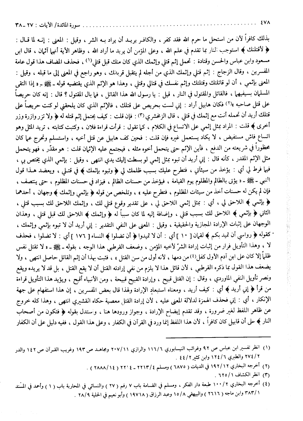 بذلك كافراً لأن من استحل ما حرم الله فقد كفر ، والكافر يريد أن يراد به الشر ، وقيل : المعنى : إنه لما قال : ) لقتلنك ( استوجب النار بما تقدم في علم الله ، وعلى المؤمن أن يريد ما أراد الله ، وظاهر الآية أنهما آثمان ، قال ابن مسعود وابن عباس والحسن وقتادة : تحمل إثم قتلي وإثمك الذي كان منك قبل قتلي ، فحذف المضاف هذا قول عامة المفسرين ، وقال الزجاج : إثم قتلي وإثمك الذي من أجله لم يتقبل قربانك ، وهو راجع في المعنى إلى ما قبله ، وقيل : المعنى بإثمي ، أن لو قاتلتك وقتلتك وإثم نفسك في قتالي وقتلي ، وهذا هو الإثم الذي يقتضيه قوله - ( صلى الله عليه وسلم ) - ' إذا التقى المسلمان بسيفهما ، فالقاتل والمقتول في النار ، قيل : يا رسول الله هذا القاتل ، فما بال المقتول ؟ قال : إنه كان حريصاً على قتل صاحبه ' فكان هابيل أراد : إني لسن بحريص على قتلك ، فالإثم الذي كان يلحقني لو كنت حريصاً على قتلك أريد أن تحمله أنت مع إثمك في قتلي ، قال الزمخشري : فإن قلت : كيف يحتمل إثم قتله له ) ولا تزر وازرة وزر أخرى ( قلت : المراد بمثل إثمي على الاتساع في الكلام ، كما تقول : قرأت قراءة فلان ، وكتبت كتابته ، تريد المثل وهو اتساع فاش مستفيض ، لا يكاد يستعمل غيره فإن قلت : فحين كف هابيل عن قتل أخيه ، واستسلم وتحرج عما كان محظوراً في شريعته من الدفع ، فأين الإثم حتى يتحمل أخوه مثله ، فيجتمع عليه الإثمان قلت : هو مقدر ، فهو يحتمل مثل الإثم المقدر ، كأنه قال : إني أريد أن تبوء بمثل إثمي لو بسطت إليك يدي انتهى ، وقيل : بإثمي الذي يختص بي ، فيما فرط لي أي : يؤخذ من سيئآتي ، فتطرح عليك بسبب ظلمك لي ) وتبوء بإثمك ( في قتلي ، ويعضد هذا قول النبي - ( صلى الله عليه وسلم ) - ' يؤتى بالظالم والمظلوم يوم القيامة ، فيؤخذ من حسنات الظالم ، فيزاد في حسنات المظلوم ، حتى ينتصف ، ( بإثمي ( اللاحق لي ، أي : بمثل إثمي اللاحق لي ، على تقدير وقوع قتلي لك ، وإثمك اللاحق لك بسبب قتلي ، الثاني ) بإثمي ( اللاحق لك بسبب قتلي ، وإضافة إليه لما كان سبباً له ) وإثمك ( اللاحق لم بسبب قتلي ، الوجهان على إثبات الإرادة المجازية والحقيقية ، وقيل : المعنى على النفي التقدير : إني أريد أن لا تبوء بإثمي وإثمك ، كقوله ) رواسي أن تميد بكم ( لقمان [ 10 ] أي : لا تميدوا ) أن تضلوا ( النساء [ 176 ] أي : لا تضلوا ، فحذف لا ، وهذا التأويل فرار من إثبات إرادة الشر لأخيه المؤمن ، وضعف القرطبي هذا الوجه ، بقوله - ( صلى الله عليه وسلم ) - ' لا تقتل نفس ظلماً إلا كان على ابن آدم الأول كفل من دمها ، لأنه أول من سن القتل ' ، فثبت بهذا أن إثم القاتل حاصل انتهى ، ولا يضعف هذا القول بما ذكره القرطبي ، لأن قائل هذا لا يلزم من نفي إرادته القتل أن لا يقع القتل ، بل قد لا يريده ويقع ونصر تأويل النفي الماوري ، وقال : إن القتل قبيح ، وإرادة القبيح قبيحة ، ومن الأنبياء أقبح ، ويؤيد هذا التأويل قراءة من قرأ ) إني أريد ( أي : كيف أريد ، ومعناه استبعاد الإرادة ولهذا قال بعض المفسرين ، إن هذا استفهام على جهة الإنكار ، أي : إني فحذف الهمزة لدلالة المعنى عليه ، لأن إرادة القتل معصية حكاه القشيري انتهى ، وهذا كله خروج عن ظاهر اللفظ لغير ضرورة ، وقد تقدم إيضاح الإرادة ، وجواز ورودها هنا ، واستدل بقوله ) فتكون من أصحاب النار ( على أن قابيل كان كافراً ، لأن هذا اللفظ إنما ورد في القرآن في الكفار ، وعلى هذا القول ، ففيه دليل على أن الكفار