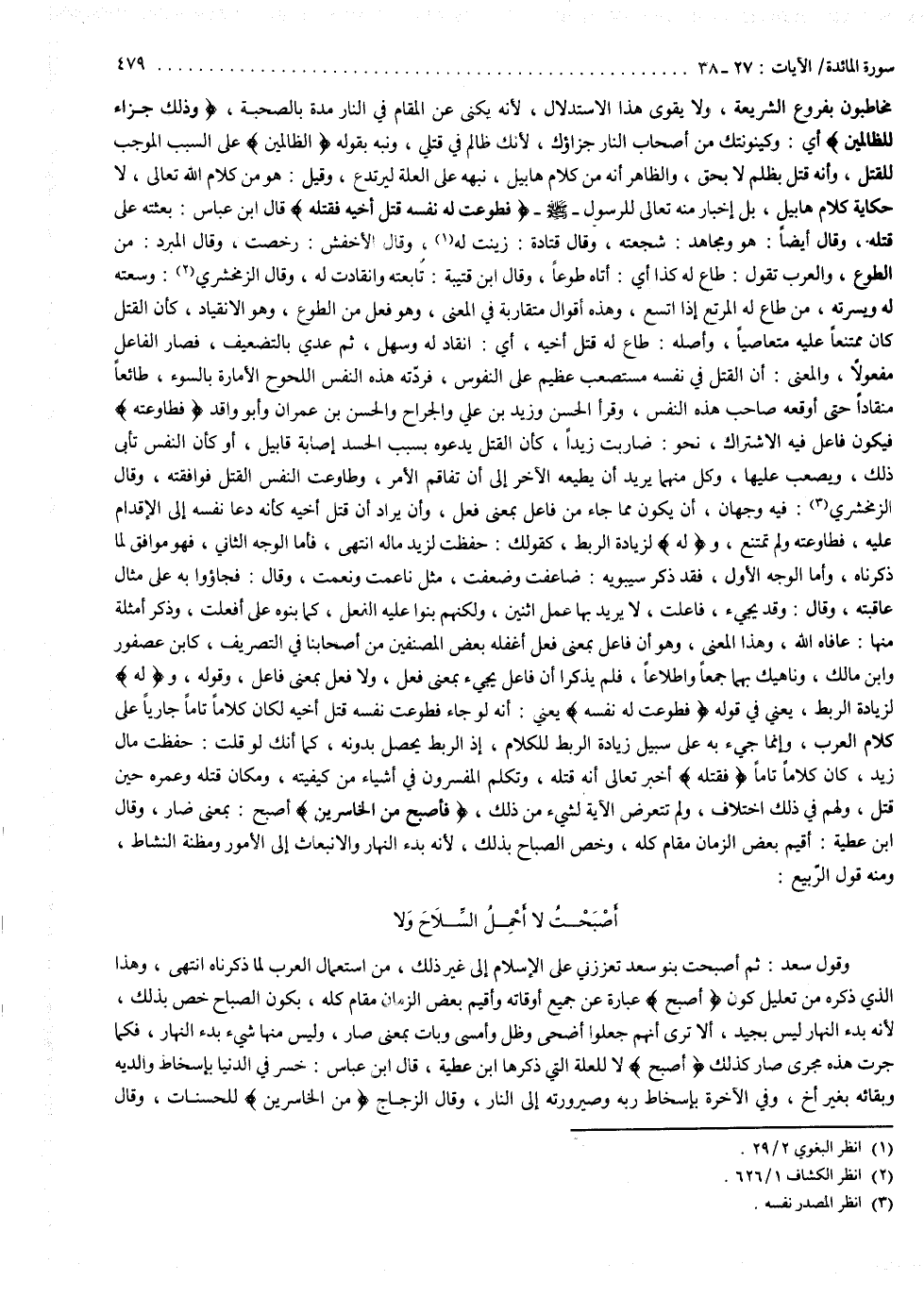 فطوعت له نفسه قتل أخيه فقتله ( قال ابن عباس : بعثته على قتله ، وقال أيضاً : هو مجاهد : شجعته ، وقال قتادة : زينت له ، وقال الأخفش : رخصت ، وقال المبرد : من الطوع ، والعرب تقول : طاع له كذا أي : أتاه طوعاً ، وقال ابن قتيبة : تابعته وانقادت له ، وقال الزمخشري : وسعته له ويسرته ، من طاع له المرتع إذا اتسع ، وهذه أقوال متقاربة في المعنى ، وهو فعل من الطوع ، وهو الانقياد ، كأن القتل كان ممتنعاً عليه متعاصياً ، أصله : طاع له قتل أخيه ، أي : انقاد له وسهل ، ثم عدي بالتضعيف ، فصار الفاعل مفعولاً ، والمعنى : أن القتل في نفسه مستصعب عظيم على النفوس ، فردته هذه النفس اللحوح الأمارة بالسوء ، طائعاً منقاداً حتى أوقعه صاحب هذه النفس ، وقرأ الحسن وزيد بن علي والجراح والحسن بن عمران وأبو واقد ) فطاوعته ( فيكون فاعل فيه الاشتراك ، نحو : ضاربت زيداً ، كأن القتل يدعوه بسبب الحسد إصابة قابيل ، أو كأن النفس تأبى ذلك ، ويصعب عليها ، وكل منهما يريد أن يطيعه الآخر إلى أن تفاقم الأمر ، وطاوعت النفس القتل فوافقته ، وقال الزمخشري فيه وجهان ، أن يكون مما جاء من فاعل بمعنى فعل ، وأن يراد أن قتل أخيه كأنه دعا نفسه إلى الإقدام عليه ، فطاوعته ولم تمتنع ، و ) له ( لزيادة الربط ، كقولك : حفظت لزيد ماله انتهى ، فأما الوجه الثاني ، فهو موافق لما ذكرناه ، وأما الوجه الأول ، فقد ذكر سيبويه : ضاعفت وضعفت ، مثل ناعمت ونعمك ، وقال : فجاؤوا به على مثال عاقبته ، وقال : قد يجيء ، فاعلت ، لا يريد بها عمل اثنين ، ولكنهم بنوا عليه الفعل ، كما بنو على أفعلت ، وذكر أمثلة منها : عافاه الله ، وهذا المعنى ، وهو أن فاعل بمعنى فعل أغفله بعض المصنفين من أصحابنا في التصريف ، كابن عصفور وابن مالك ، وناهيك بهما جمعاً واطلاعاً ، فلم يذكرا أن فاعل يجيء بمعنى فعل ، ولا فعل بمعنى فاعل ، قوله ، و ) له ( الزيادة الربط ، يعني في قوله ) فطوعت له نفسه ( يعني : أنه لو جاء فطوعت نفسه قتل أخيه لكان كلاماً تاماً جارياً على كلام العرب ، وإنما جيء به على سبيل زيادة الربط للكلام ، إذ الربط يحصل بدونه ، كما أنك لو قلت : حفظت مال زيد ، كان كلاماً تاماً ) فقتله ( أخبر تعالى أنه قتله ، وتكلم المفسرون في أشياء من كيفيته ، ومكان قتله وعمره حين قتل ، ولهم في ذلك اختلاف ، ولم تتعرض الآية لشيء من ذلك ، ( فأصبح من الخاسرين ( أصبح : بمعنى ضار ، وقال ابن عطية : أقيم بعض الزمان مقام كله ، وخص الصباح بذلك ، لأنه بدء النهار والانبعاث إلى الأمور ومظنة النشاط ، ومنه قول الربيع : أصبحت لا أحمل السلاح ولا