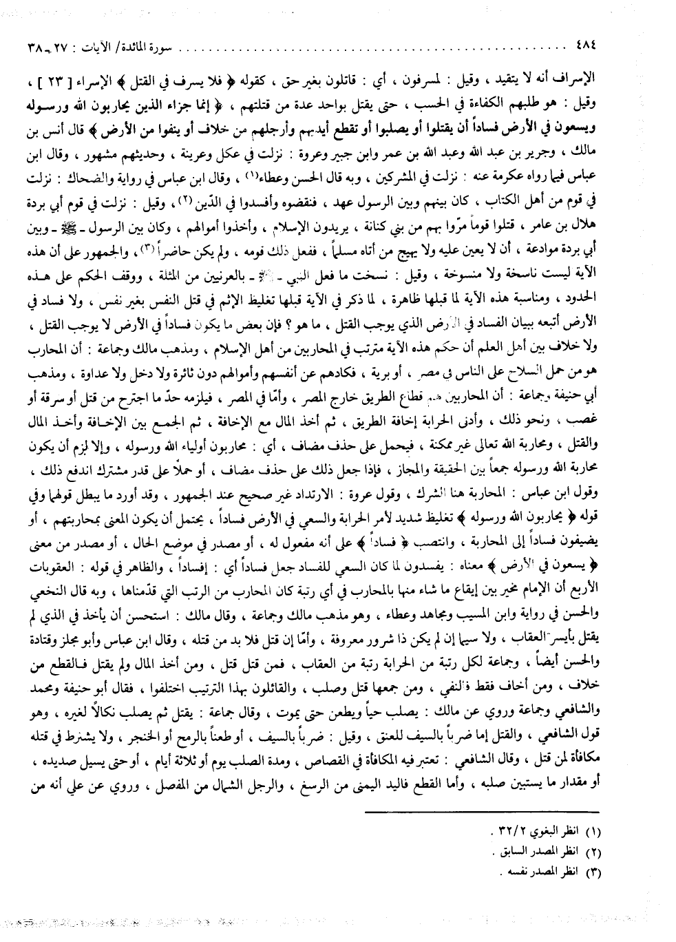 ( إنما جزاء الذين يحابون الله ورسوله ويسعون في الأرض فساداً أن يقتلوا أو يصلبوا أو تقطع أيديهم وأرجلهم من خلاف أو ينفوا من الأرض ( قال أنس بن مالك ، وجرير بن عبد الله وعبد الله بن عمر وابن جبير وعروة : نزلت في عكل عرينة ، وحديثهم مشهور ، وقال ابن عباس فيما رواه عكرمة عنه : نزلت في المشركين ، وبه قال الحسن وعطاء ، وقال ابن عباس في رواية والضحاك : نزلت في قوم من أهل الكتاب ، كان بينهم وبين الرسول عهد ، فنقضوه وأفسدوا في الدين ، وقيل : نزلت في قوم أبي بردة هلال بن عامر ، قتلوا قوماً مروا بهم من كنانة ، يريدون الإسلام ، وأخذوا أموالهم ، وكان بين الرسول - ( صلى الله عليه وسلم ) - وبين أبي بردة موادعة ، أن لا يعين عليه ولا يهيج من أتاه مسلماً ، ففعل ذلك قومه ، ولم يكن حاضراً ، والجمهور على أن هذه الآية ليست ناسخة ولا منسوخة ، وقيل : نسخت ما فعل النبي - ( صلى الله عليه وسلم ) - بالعرنيين من المثلة ، ووقف الحكم على هذه الحدود ، ومناسبة هذه الآية لما قبلها ظاهرة ، لما ذكر في الآية قبلها تغليظ الإثم في قتل النفس بغير نفس ، ولا فساد في الأرض أتبعه ببيان الفساد في الأرض الذي يوجب القتل ، ما هو ؟ فإن بعض ما يكون فساداً في الأرض لا يوجب القتل ، ولا خلاف بين أهل العلم أن حكم هذه الآية مترتب في المحاربين من أهل الإسلام ، ومذهب مالك وجماعة : أن المحارب هو من حمل السلاح على الناس في مصر ، أو برية ، فكادهم عن أنفسهم وأموالهم دون ثاثرة ولا دخل ولا عداوة ، ومذهب أبي حنيفة وجماعة : أن المحاربين هم قطاع الطريق خارج المصر ، وأما في المصر ، فيلزمه حد ما اجترح من قتل أو سرقة أو غصب ، ونحو ذلك ، وأدنى الحرابة إخافة الطريق ، ثم أخذ المال مع الإخافة ، ثم الجمع بين الإخافة وأخذ المال والقتل ، ومحاربة الله تعالى غير ممكنة ، فيحمل على حذف مضاف ، أو حملاً على قدر مشترك اندفع ذلك ، وقول ابن عباس : المحاربة هنا الشرك ، وقول عروة : الارتداد غير صحيح عند الجمهور ، وقد أورد ما يبطل قولهما وفي قوله ) يحاربون الله ورسوله ( تغليظ شديد لأمر الحرابة والسعي في الأرض فساداً ، ويحتمل أن يكون المعنى بمحاربتهم ، أو يضيفون فساداً إلى المحاربة ، وانتصب ) فسادا ( على أنه مفعول به ، أو مصدر في موضع الحال ، أو مصدر من معنى ) يسعون في الأرض ( معناه : يفسدون لما كان السعي للفساد جعل فساداً أي : إفساداً ، والظاهر في قوله : العقوبات الأربع أن الإمام مخير بين إيقاع ما شاء منها بالمحارب في أي رتبة كان المحارب من الرتب التي قدمناها ، وبه قال النخعي والحسن في رواية وابن المسيب ومجاهد وعطاء ، وهو مذهب مالك وجماعة ، وقال مالك : استحسن أن يأخذ في الذي لم يقتل بأيسر العقاب ، ولا سيما إن لم يكن ذا شرور معروفة ، وأما إن قتل فلا بد من قتله ، وقال ابن عباس وأبو مجلز وقتادة والحسن أيضاً ، وجماعة لكل رتبة من الحرابة رتبة من العقاب ، فمن قتل قتل ، ومن أخذ المال ولم يقتل فالقطع من خلاف ، ومن أخاف فقط فالنفي ، ومن جمعها قتل وصلب ، والقائلون بهذا الترتيب اختلفوا ، فقال أبو حنيفة ومحمد والشافعي وجماعة وروي عن مالك : يصلب حياً ويطعن حتى يموت ، وقال جماعة : يقتل ثم يصلب نكالاً لغيره ، وهو وقول الشافعي ، والقتل إما ضرباً بالسيف للعنق ، وقيل : ضرباً بالسيف ، أو طعناً بالرمح أو الخنجر ، ولا يشترط في قتله مكافأة لمن قتل ، وقال الشافعي : تعتبر في المكافأة في القصاص ، ومدة الصلب يوم أو ثلاثة أيام ، أو حتى يسيل صديده ، أو مقدار ما يستبين صلبه ، وأما القطع فاليد اليمنى من الرسغ ، والرجل الشمال من المفصل ، وروي عن علي أنه من