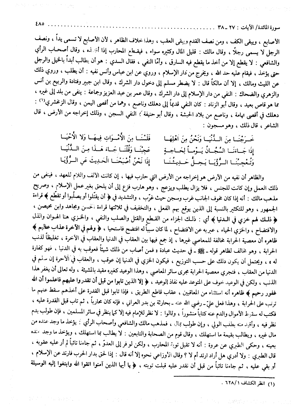 الأصابع ، ويبقى الكف ، ومن نصف القدم يبقى العقب ، وهذا خلاف الظاهر ، لأن الأصابع لا تسمى يداً ، ونصف الرجل لا يسمى رجلاً ، وقال مالك : قليل المال وكثيره سواء ، فيقطع المحارب إذا أخذه ، وقال أصحاب الرأي والشافعي : لا يقطع إلا من أخذ ما يقطع فيه السارق ، وأما النفي ، فقال السدي : هو أن يطالب أبداً بالخيل والرجل حتى يؤخذ فيقام عليه حد الله ، ويخرج من دار الإسلام ، وروي عن ابن عباس وأنس نفيه : أن يطلب ، وروي ذلك عن الليث ومالك ، إلا أن مالكاً قال : لا يضطر مسلم إلى دخول دار الشرك وقال ابن جبير وقتادة والربيع بن أنس والزهري والضحاك : النفي من دار الإسلام إلى دار الشرك ، وقال عمر بن عبد العزيز وجماعة : ينفى من بلد إلى غيره ، مما هو قاص بعيد ، وقال أبو الزناد : كان النفي قديماً إلى دهلك وناصع ، وهما من أقصى اليمن ، وقال الزمخشري دهلك في أقصى تهامة ، وناصع من بلاد الحبشة ، وقال أبو حنيفة : النفي السجن ، وذلك إخراجه من الأرض ، قال الشاعر ، قال ذلك : وهو مسجون : خرجنا من الدنيا ونحن من اهليها