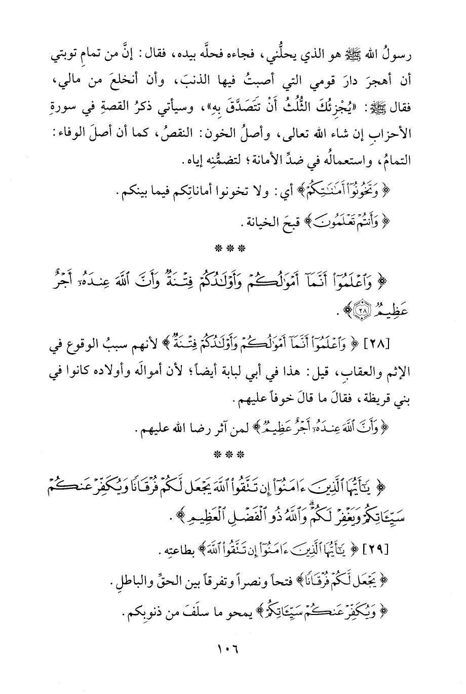 [28] {وَاعْلَمُوا أَنَّمَا أَمْوَالُكُمْ وَأَوْلَادُكُمْ فِتْنَةٌ} لأنهم سببُ الوقوع في الإثم والعقابِ، قيل: هذا في أبي لبابة أيضًا؛ لأنّ أموالَه وأولاده كانوا في بني قريظة، فقالَ ما قالَ خوفًا عليهم.