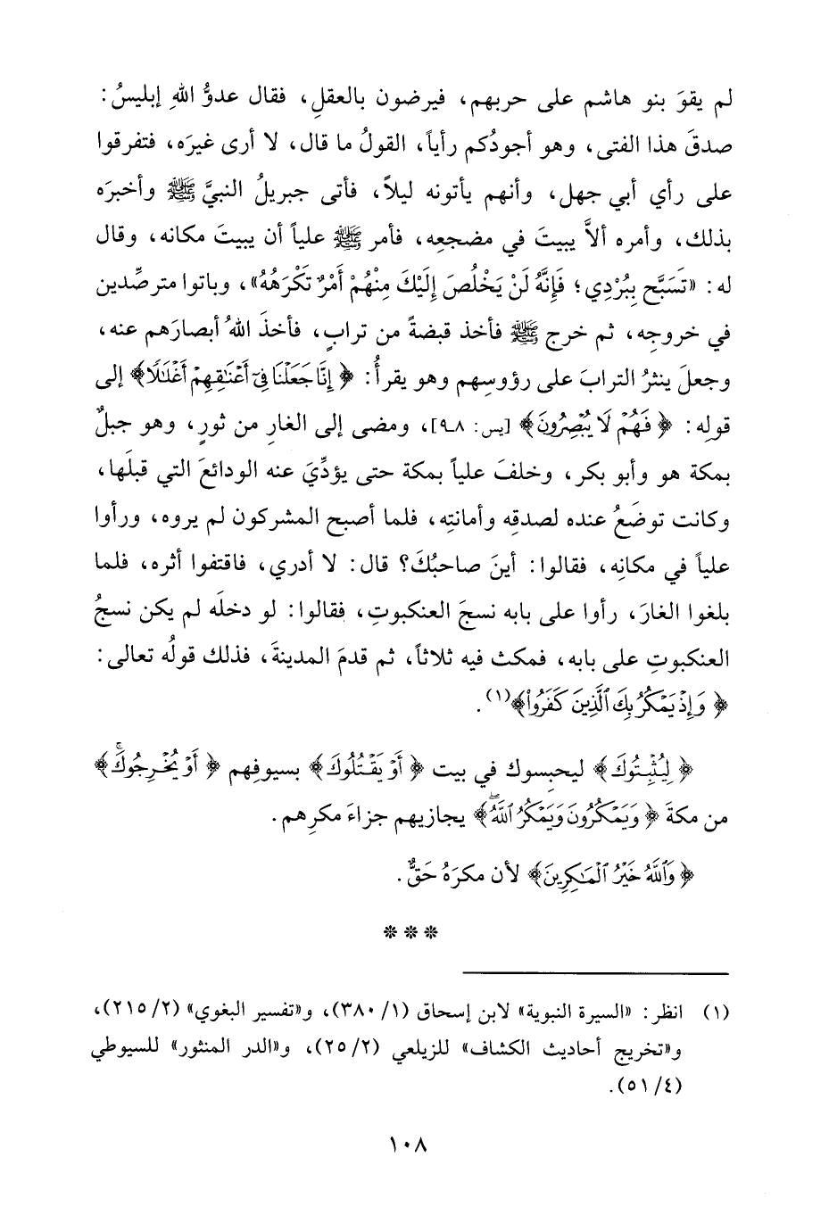 لم يقوَ بنو هاشم على حربهم، فيرضون بالعقلِ، فقال عدوُّ اللهِ إبليسُ: صدقَ هذا الفتى، وهو أجودُكم رأيًا، القولُ ما قال، لا أرى غيرَه، فتفرقوا على رأي أبي جهل، وأنّهم يأتونه ليلًا، فأتى جبريلُ النبيَّ - صلى الله عليه وسلم - وأخبره بذلك، وأمره ألَّا يبيتَ في مضجعِه، فأمر - صلى الله عليه وسلم - عليًّا أن يبيتَ مكانه، وقال له: "تَسَبَّح بِبُرْدِي؛ فَإِنَّهُ لَنْ يَخْلُصَ إِلَيْكَ مِنْهُمْ أَمْرٌ تَكْرَهُهُ"، وباتوا مترصِّدين في خروجِه، ثم خرج - صلى الله عليه وسلم - فأخذ قبضةً من ترابٍ، فأخذَ اللهُ أبصارَهم عنه، وجعلَ ينثرُ الترابَ على رؤوسِهم وهو يقرأُ: {إِنَّا جَعَلْنَا فِي أَعْنَاقِهِمْ أغلالًا} إلى قولِه {فَهُمْ لَا يُبْصِرُونَ} [يس: 8 - 9] ومضى إلى الغارِ من ثورٍ، وهو جبلٌ بمكة هو وأبو بكر، وخلفَ عليًّا بمكة حتّى يؤدِّيَ عنه الودائعَ الّتي قبلَها، وكانت توضَعُ عنده لصدقِه وأمانتِه، فلما أصبح المشركون لم يروه، ورأوا عليًّا في مكانِه، فقالوا: أينَ صاحبُكَ؟ قال: لا أدري، فاقتفوا أثره، فلما بلغوا الغارَ، رأوا على بابه نسجَ العنكبوتِ، فقالوا: لو دخلَه لم يكن نسجُ العنكبوتِ على بابه، فمكث فيه ثلاثًا، ثمّ قدمَ المدينةَ، فذلك قولُه تعالى: {وَإِذْ يَمْكُرُ بِكَ الَّذِينَ كَفَرُوا} (¬1).