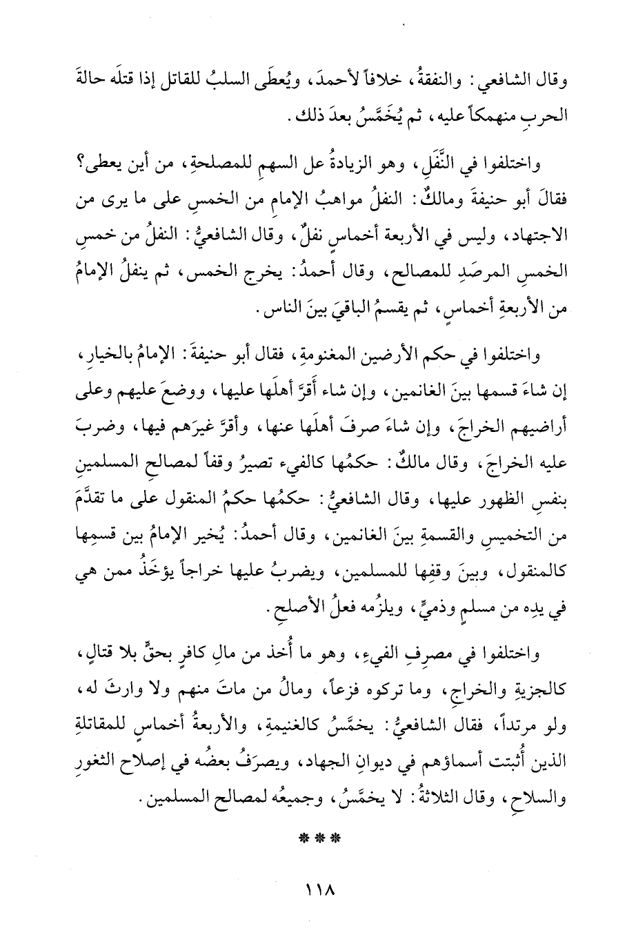 واختلفوا في مصرِفِ الفيءِ، وهو ما أُخذ من مالِ كافرٍ بحقٍّ بلا قتالٍ، كالجزيةِ والخراجِ، وما تركوه فزعًا، ومالُ من ماتَ منهم ولا وارثَ له، ولو مرتدًا، فقال الشّافعيُّ: يخمَّسُ كالغنيمةِ، والأربعةُ أخماسٍ للمقاتلةِ الذين أُثبتت أسماؤهم في ديوانِ الجهاد، ويصرَفُ بعضه في إصلاح الثغورِ والسلاحِ، وقال الثلاثةُ: لا يخمَّسُ، وجميعُه لمصالح المسلمين.