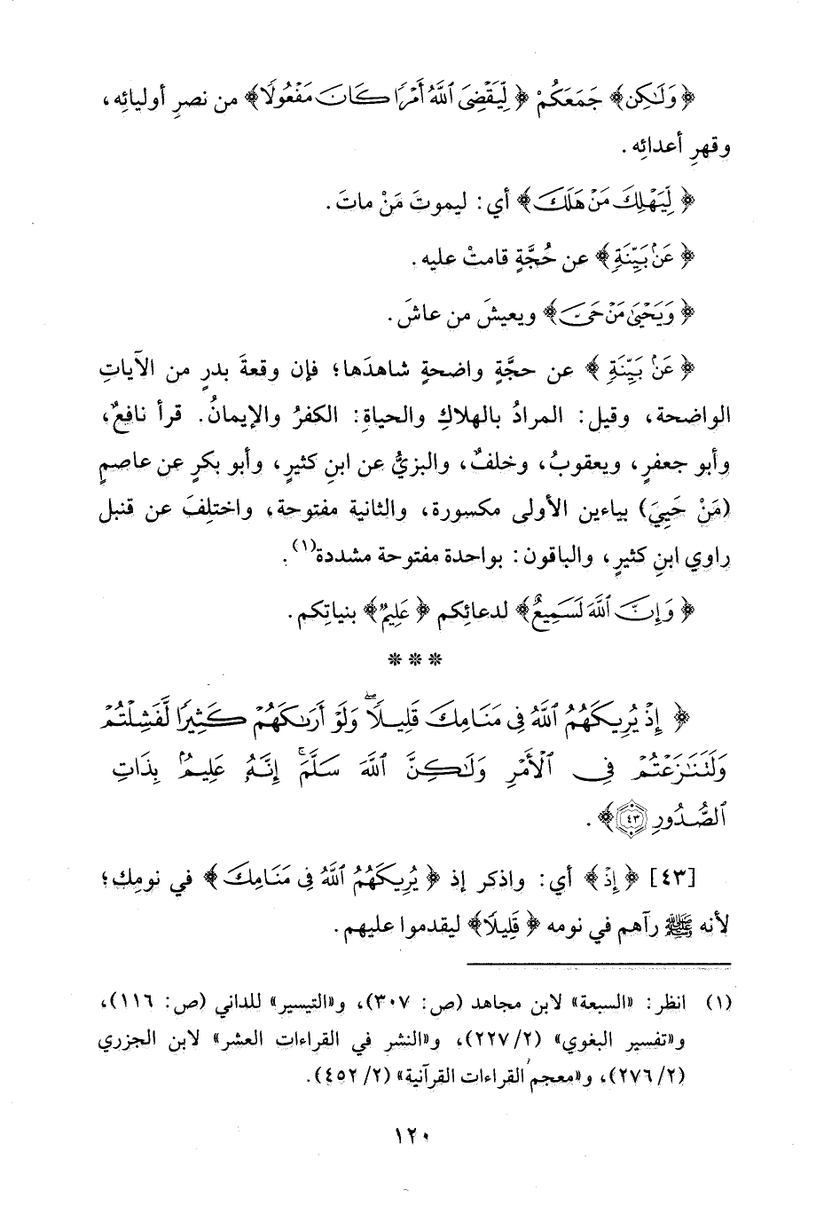 {إِذْ يُرِيكَهُمُ اللَّهُ فِي مَنَامِكَ وَلَوْ أَرَاكَهُمْ كَثِيرًا لَفَشِلْتُمْ وَلَتَنَازَعْتُمْ فِي الْأَمْرِ وَلَكِنَّ اللَّهَ سَلَّمَ إِنَّهُ عَلِيمٌ بِذَاتِ الصُّدُورِ (43)}.