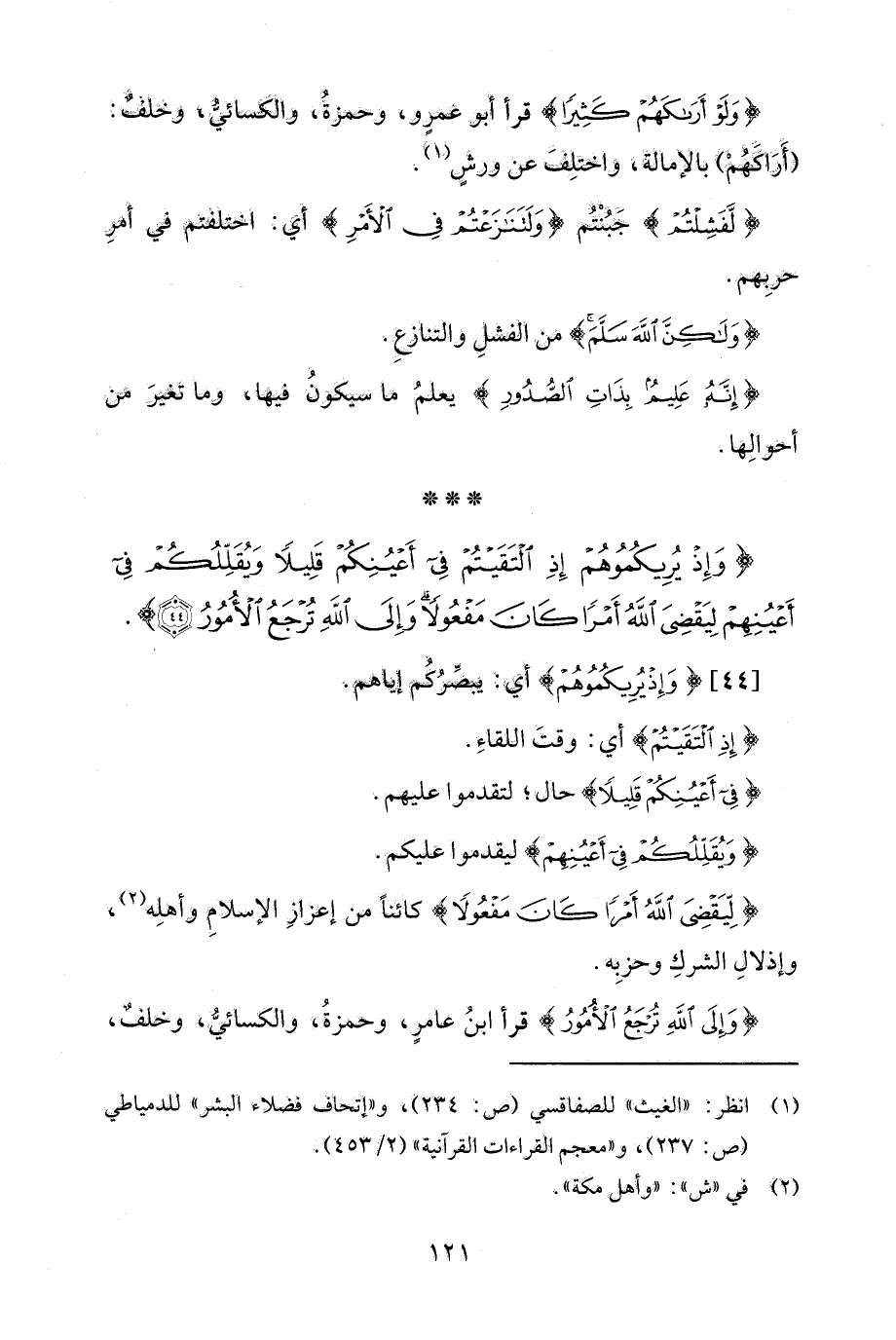 {وَلَوْ أَرَاكَهُمْ كَثِيرًا} قرأ أبو عمرٍو، وحمزةُ، والكسائيُّ، وخلفٌ: (أَرَاكَهُمْ) بالإمالة، واختلِفَ عن ورشٍ (¬1).
