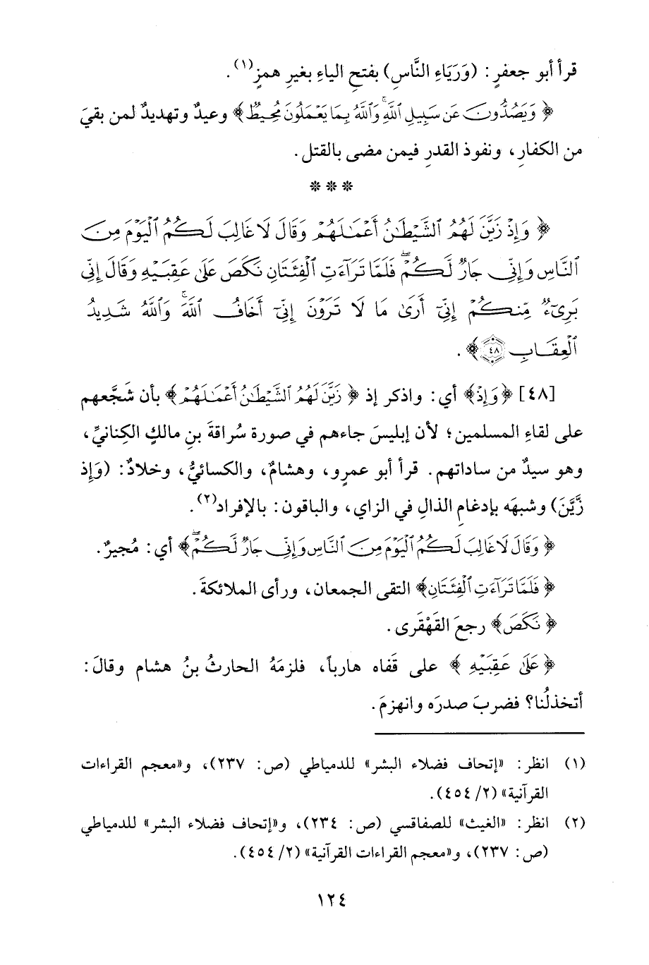 [48] {وَإِذْ} أي: واذكر إذ {زَيَّنَ لَهُمُ الشَّيْطَانُ أَعْمَالَهُمْ} بأن شَجَّعهم على لقاءِ المسلمين، لأنّ إبليسَ جاءهم في صورة سُراقةَ بنِ مالكٍ الكِنانيِّ، وهو سيدٌ من ساداتهم. قرأ أبو عمرٍو، وهشامٌ، والكسائيُّ، وخلادٌ: (وَإِذ زيَّنَ) وشبهَه بإدغامِ الذالِ في الزاي، والباقون: بالإفراد (¬2).