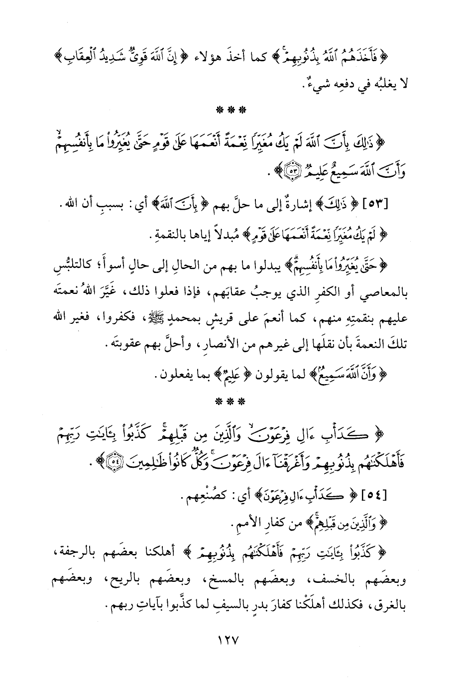 {كَدَأْبِ آلِ فِرْعَوْنَ وَالَّذِينَ مِنْ قَبْلِهِمْ كَذَّبُوا بِآيَاتِ رَبِّهِمْ فَأَهْلَكْنَاهُمْ بِذُنُوبِهِمْ وَأَغْرَقْنَا آلَ فِرْعَوْنَ وَكُلٌّ كَانُوا ظَالِمِينَ (54)}.