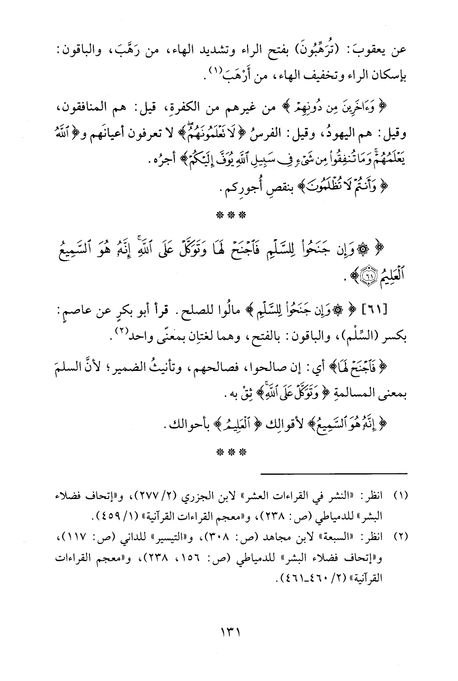 [61] {وَإِنْ جَنَحُوا لِلسَّلْمِ} مالُوا للصلح. قرأ أبو بكرٍ عن عاصمٍ: بكسر (السِّلْم)، والباقون: بالفتح، وهما لغتاِن بمعنًى واحد (¬2).