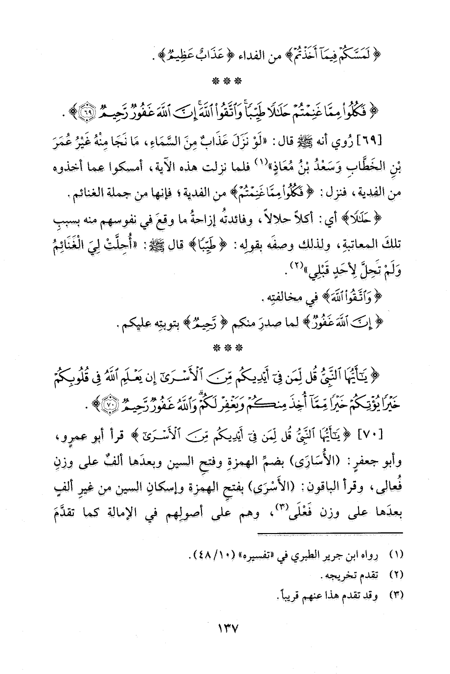 [70] {يَاأَيُّهَا النَّبِيُّ قُلْ لِمَنْ فِي أَيْدِيكُمْ مِنَ الْأَسْرَى} قرأ أبو عمرٍو، وأبو جعفرٍ؛ (الأُسَارَى) بضمِّ الهمزةِ وفتح السين وبعدَها ألفٌ على وزنِ فُعالى، وقرأ الباقون: (الأَسْرَى) بفتحِ الهمزة وإسكانِ السين من غيرِ ألفٍ بعدَها على وزن فَعْلَى (¬3)، وهم على أصولِهم في الإمالة كما تقدَّمَ