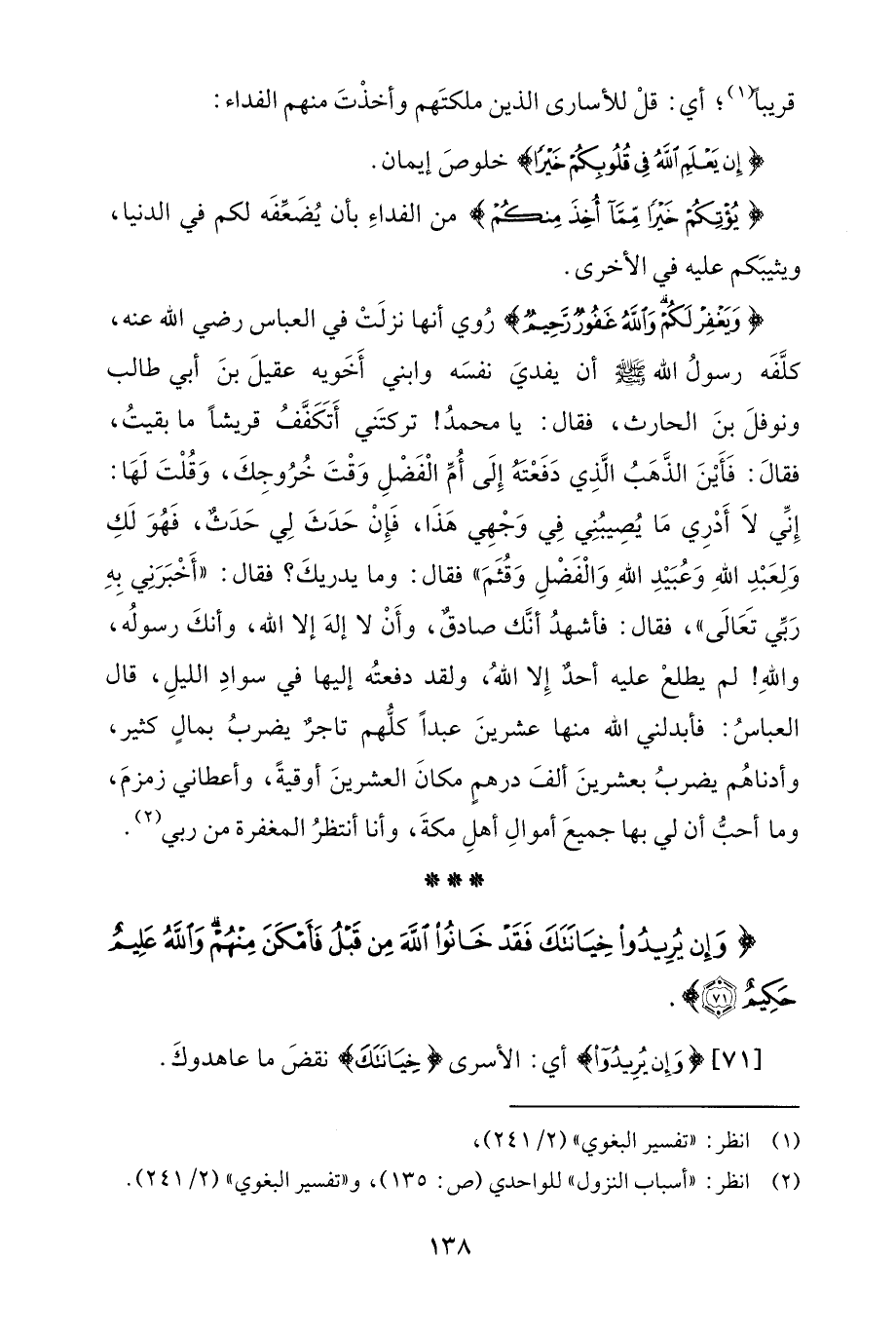 {وَيَغْفِرْ لَكُمْ وَاللَّهُ غَفُورٌ رَحِيمٌ} رُوي أنّها نزلَتْ في العباس رضي الله عنه، كلَّفَه رسولُ الله - صلى الله عليه وسلم - أن يفديَ نفسَه وابني أَخَويه عقيلَ بنَ أبي طالب ونوفلَ بنَ الحارث، فقال: يا محمدُ! تركتَني أَتَكَفَّفُ قريشًا ما بقيتُ، فقال: فَأَيْنَ الذَّهَبُ الَّذِي دَفَعْتَهُ إِلَى أُمِّ الْفَضْلِ وَقْتَ خُرُوجِكَ، وَقُلْتَ لَهَا: إِنِّي لَا أَدْرِي مَا يُصِيبُنِي فِي وَجْهِي هَذَا، فَإِنْ حَدَثَ لِي حَدَثٌ، فَهُوَ لَكِ وَلِعَبْدِ اللهِ وَعُبَيْدِ اللهِ وَالْفَضلِ وَقُثَمَ" فقال: وما يدريكَ؟ فقال: "أَخْبَرَنِي بِهِ رَبِّي تَعَالَى"، فقال: فأشهدُ أنَّك صادقٌ، وأَنْ لا إلهَ إِلَّا الله، وأنكَ رسولُه، واللهِ! لم يطلعْ عليه أحدٌ إِلا اللهُ، ولقد دفعتُه إليها في سوادِ اللّيلِ، قال العباسُ: فأبدلني الله منها عشرينَ عبدًا كلُّهم تاجرٌ يضربُ بمالٍ كثير، وأدناهُم يضربُ بعشرينَ ألفَ درهمٍ مكانَ العشرينَ أوقيةً، وأعطاني زمزمَ، وما أحبُّ أن لي بها جميعَ أموال أهلِ مكةَ، وأنا أنتظرُ المغفرة من ربي (¬2).