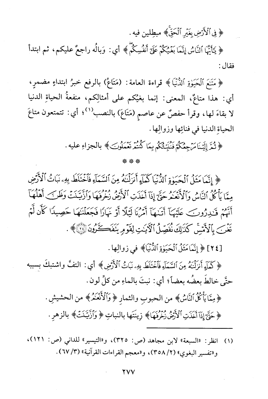 {إِنَّمَا مَثَلُ الْحَيَاةِ الدُّنْيَا كَمَاءٍ أَنْزَلْنَاهُ مِنَ السَّمَاءِ فَاخْتَلَطَ بِهِ نَبَاتُ الْأَرْضِ مِمَّا يَأْكُلُ النَّاسُ وَالْأَنْعَامُ حَتَّى إِذَا أَخَذَتِ الْأَرْضُ زُخْرُفَهَا وَازَّيَّنَتْ وَظَنَّ أَهْلُهَا أَنَّهُمْ قَادِرُونَ عَلَيْهَا أَتَاهَا أَمْرُنَا لَيْلًا أَوْ نَهَارًا فَجَعَلْنَاهَا حَصِيدًا كَأَنْ لَمْ تَغْنَ بِالْأَمْسِ كَذَلِكَ نُفَصِّلُ الْآيَاتِ لِقَوْمٍ يَتَفَكَّرُونَ (24)}.