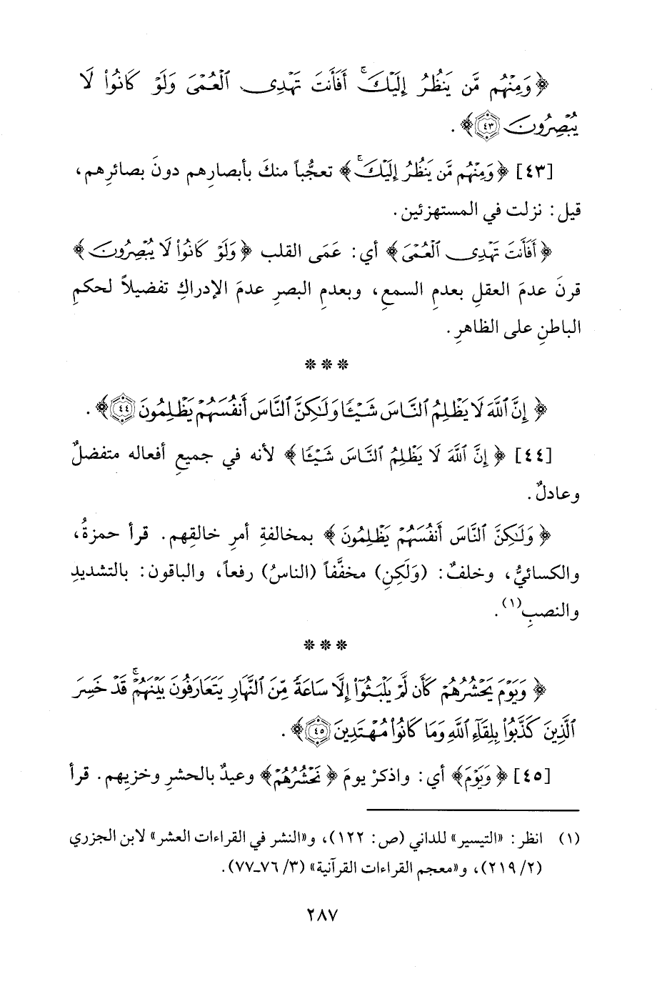 [44] {إِنَّ اللَّهَ لَا يَظْلِمُ النَّاسَ شَيْئًا} لأنه في جميعِ أفعاله متفضلٌ وعادلٌ.