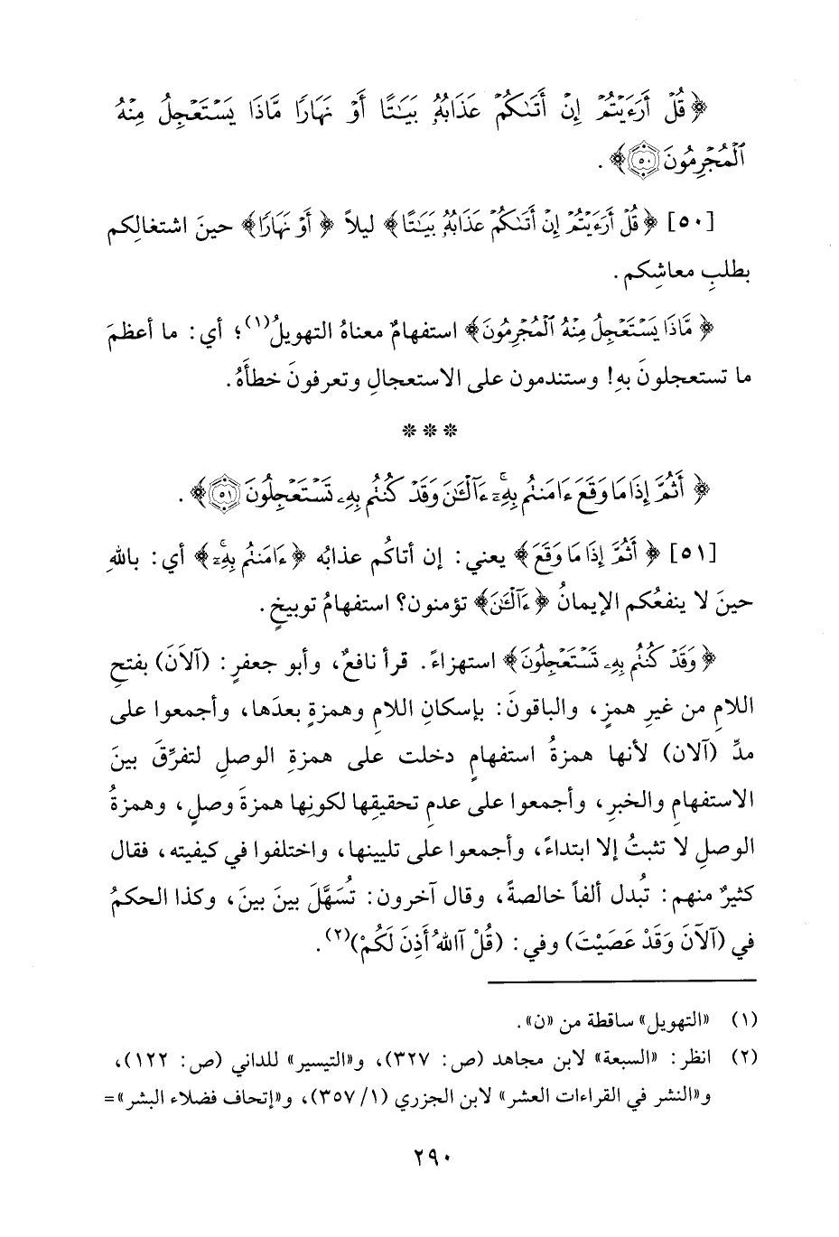 {وَقَدْ كُنْتُمْ بِهِ تَسْتَعْجِلُونَ} استهزاءً. قرأ نافعٌ، وأبو جعفرٍ: (آلاَنَ) بفتحِ اللامِ من غيرِ همزٍ، والباقونَ: بإسكانِ اللامِ وهمزةٍ بعدَها، وأجمعوا على مدِّ (آلان) لأنها همزةُ استفهامٍ دخلت على همزةِ الوصلِ لتفرِّقَ بينَ الاستفهامِ والخبرِ، وأجمعوا على عدمِ تحقيقِها لكونها همزةَ وصلٍ، وهمزةُ الوصلِ لا تثبتُ إلا ابتداءً، وأجمعوا على تليينها، واختلفوا في كيفيته، فقال كثيرٌ منهم: تبُدل ألفًا خالصةً، وقال آخرون: تسُهَّلَ بينَ بينَ، وكذا الحكمُ في (آلاَنَ وَقَدْ عَصَيْتَ) وفي: (قُلْ آللهُ أَذِنَ لَكُمْ) (¬2).