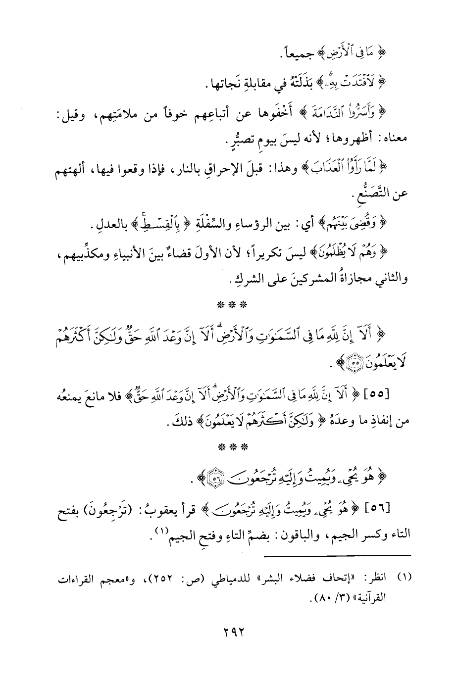 [56] {هُوَ يُحْيِي وَيُمِيتُ وَإِلَيْهِ تُرْجَعُونَ (56)} قرأ يعقوبُ: (تَرْجِعُونَ) بفتح التاء وكسر الجيم، والباقون؛ بضمِّ التاءِ وفتحِ الجيم (¬1).
