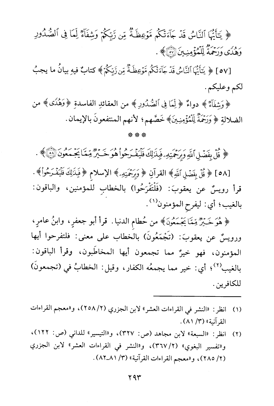 [58] {قُلْ بِفَضْلِ اللَّهِ} القرآنِ {وَبِرَحْمَتِهِ} الإسلامِ {فَبِذَلِكَ فَلْيَفْرَحُوا}.