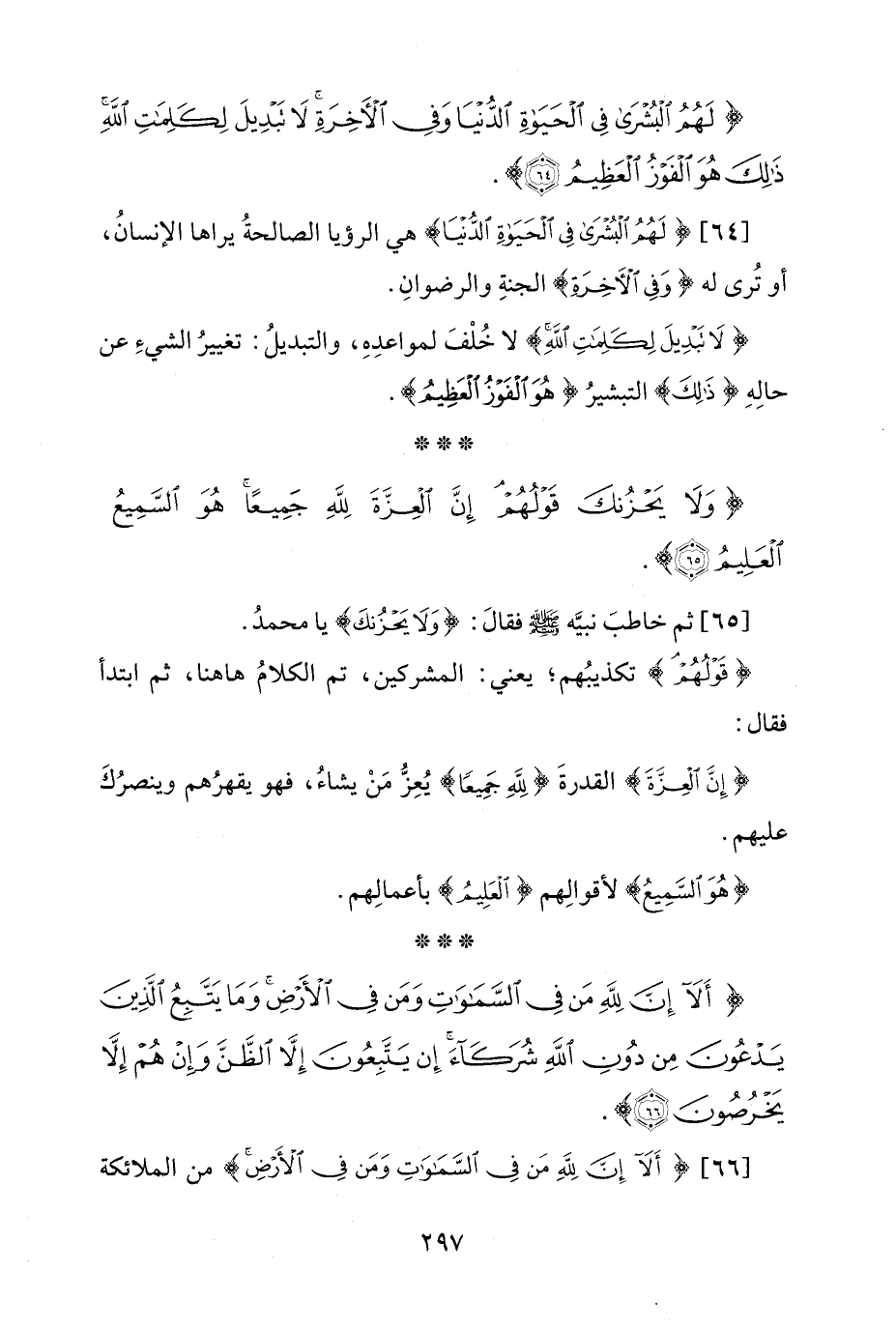 [64] {لَهُمُ الْبُشْرَى فِي الْحَيَاةِ الدُّنْيَا} هي الرؤيا الصالحةُ يراها الإنسانُ، أو تُرى له {وَفِي الْآخِرَةِ} الجنةِ والرضوانِ.