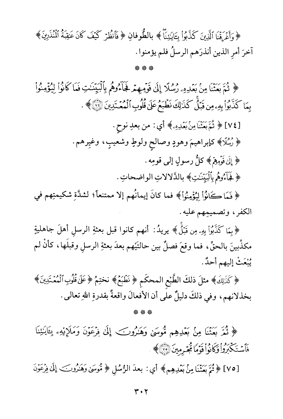{ثُمَّ بَعَثْنَا مِنْ بَعْدِهِ رُسُلًا إِلَى قَوْمِهِمْ فَجَاءُوهُمْ بِالْبَيِّنَاتِ فَمَا كَانُوا لِيُؤْمِنُوا بِمَا كَذَّبُوا بِهِ مِنْ قَبْلُ كَذَلِكَ نَطْبَعُ عَلَى قُلُوبِ الْمُعْتَدِينَ (74)}.