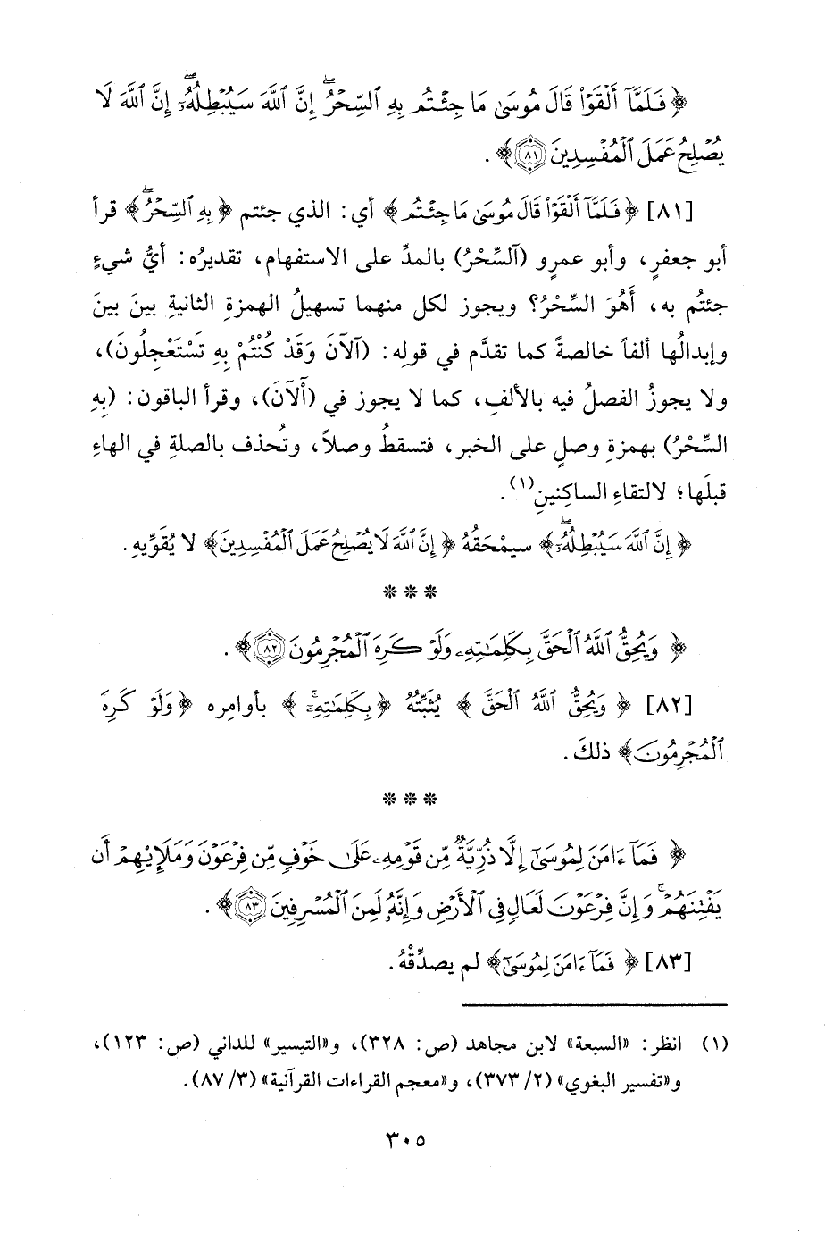 [81] {فَلَمَّا أَلْقَوْا قَالَ مُوسَى مَا جِئْتُمْ} أي: الذي جئتم {بِهِ السِّحْرُ} قرأ أبو جعفرٍ، وأبو عمرٍو (آلسِّحْرُ) بالمدِّ على الاستفهام، تقديرُه: أيُّ شيءٍ جئتُم به، أَهُوَ السِّحْرُ؟ ويجوز لكل منهما تسهيلُ الهمزةِ الثانيةِ بينَ بينَ وإبدالُها ألفًا خالصةً كما تقدَّم في قوله: (آلاَنَ وَقَدْ كُنْتُمْ بِهِ تَسْتَعْجِلُونَ)، ولا يجوزُ الفصلُ فيه بالألفِ، كما لا يجوز في (آلاَنَ)، وقرأ الباقون: (بِهِ السِّحْرُ) بهمزةِ وصلٍ على الخبر، فتسقطُ وصلًا، وتُحذف بالصلةِ في الهاءِ قبلَها؛ لالتقاءِ الساكِنينِ (¬1).