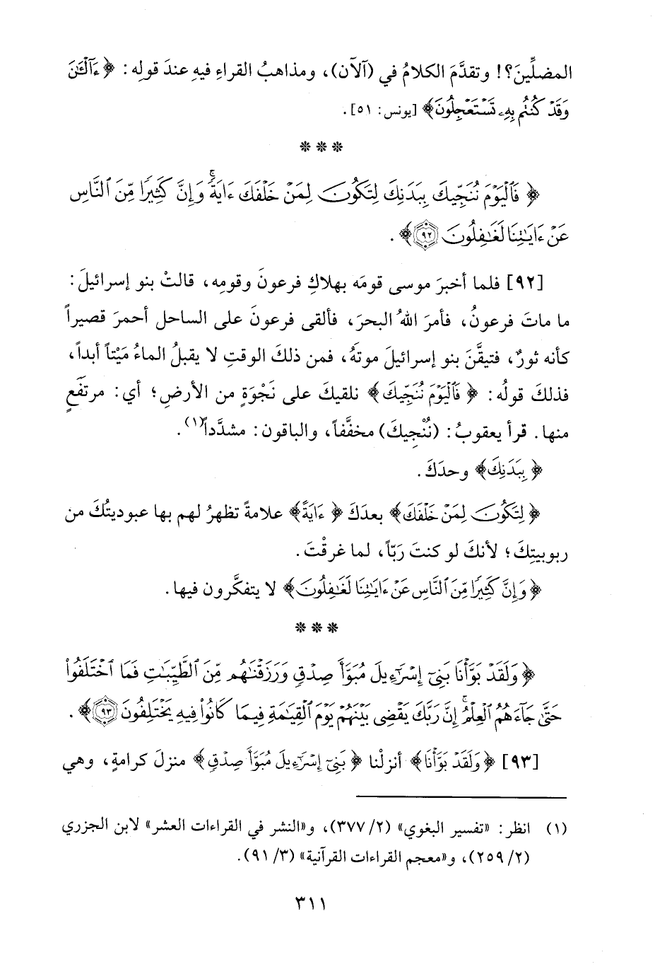 [92] فلما أخبرَ موسى قومَه بهلاكِ فرعونَ وقومِه، قالتْ بنو إسرائيلَ: ما ماتَ فرعونُ، فأمرَ اللهُ البحرَ، فألقى فرعونَ على الساحل أحمرَ قصيرًا كأنه ثورٌ، فتيقَّنَ بنو إسرائيلَ موتَهُ، فمن ذلكَ الوقتِ لا يقبلُ الماءُ مَيْتًا أبدًا، فذلكَ قولُه: {فَالْيَوْمَ نُنَجِّيكَ} نلقيكَ على نَجْوَةٍ من الأرضِ؛ أي: مرتفعٍ منها. قرأ يعقوبُ: (نُنْجِيكَ) مخفَّفًا، والباقون: مشدَّدًا (¬1).