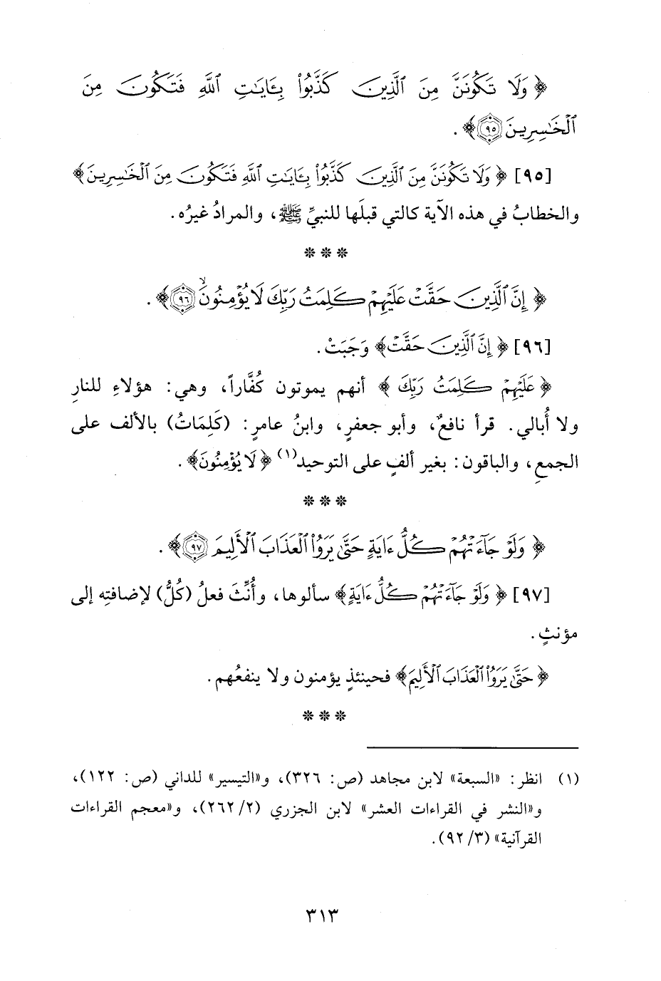 {عَلَيْهِمْ كَلِمَتُ رَبِّكَ} أنهم يموتون كُفَّارًا، وهي: هؤلاءِ للنارِ ولا أُبالي. قرأ نافعٌ، وأبو جعفرٍ، وابنُ عامرٍ: (كَلِمَاتُ) بالألف على الجمعِ، والباقون: بغير ألفٍ على التوحيد (¬1) {لَا يُؤْمِنُونَ}.
