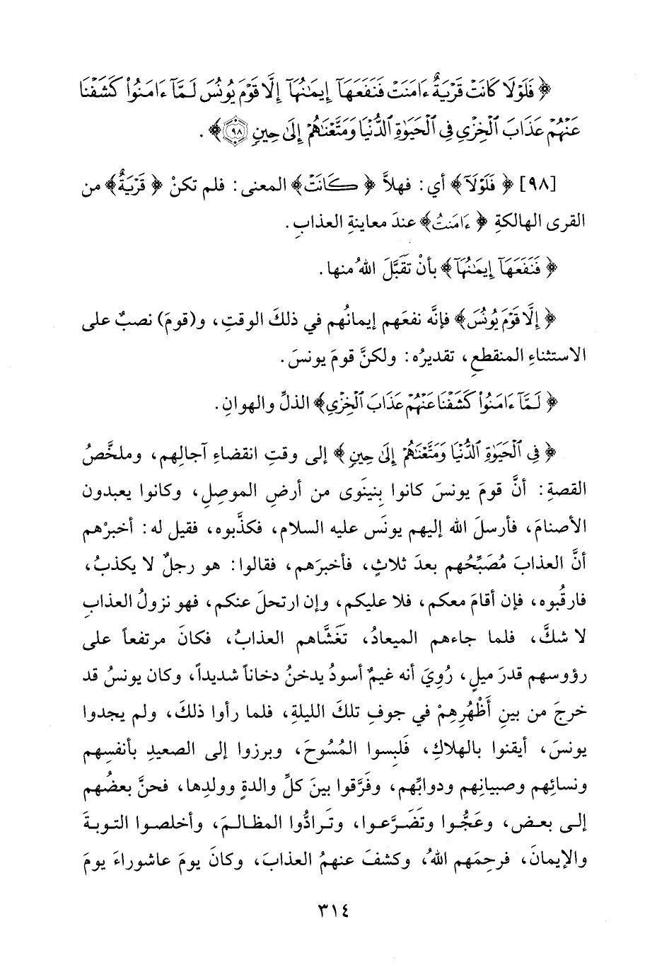 {فَلَوْلَا كَانَتْ قَرْيَةٌ آمَنَتْ فَنَفَعَهَا إِيمَانُهَا إِلَّا قَوْمَ يُونُسَ لَمَّا آمَنُوا كَشَفْنَا عَنْهُمْ عَذَابَ الْخِزْيِ فِي الْحَيَاةِ الدُّنْيَا وَمَتَّعْنَاهُمْ إِلَى حِينٍ (98)}.
