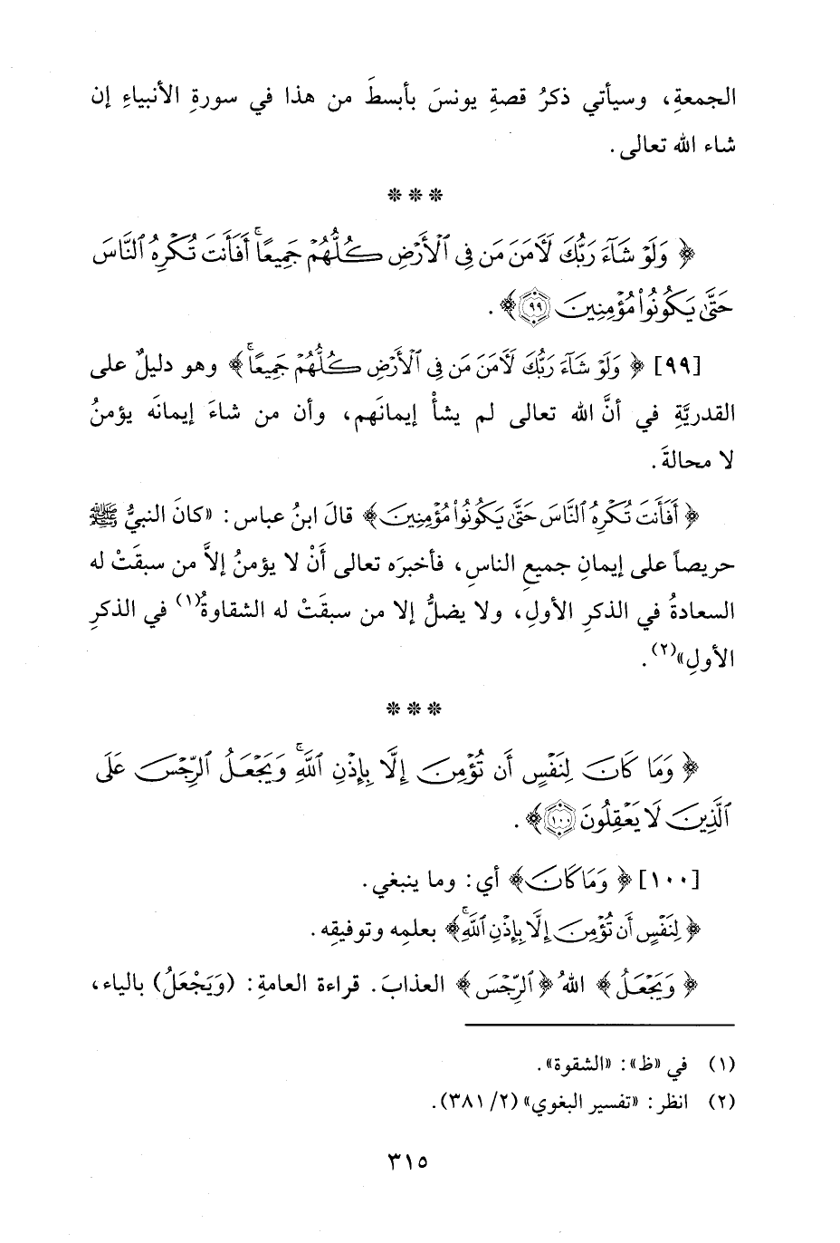 {أَفَأَنْتَ تُكْرِهُ النَّاسَ حَتَّى يَكُونُوا مُؤْمِنِينَ} قالَ ابنُ عباس: "كانَ النبيُّ - صلى الله عليه وسلم - حريصًا على إيمانِ جميعِ الناسِ، فأخبرَه تعالى أَنْ لا يؤمنُ إلَّا من سبقَتْ له السعادةُ في الذكرِ الأولِ، ولا يضلُّ إلا من سبقَتْ له الشقاوةُ (¬1) في الذكرِ الأولِ" (¬2).