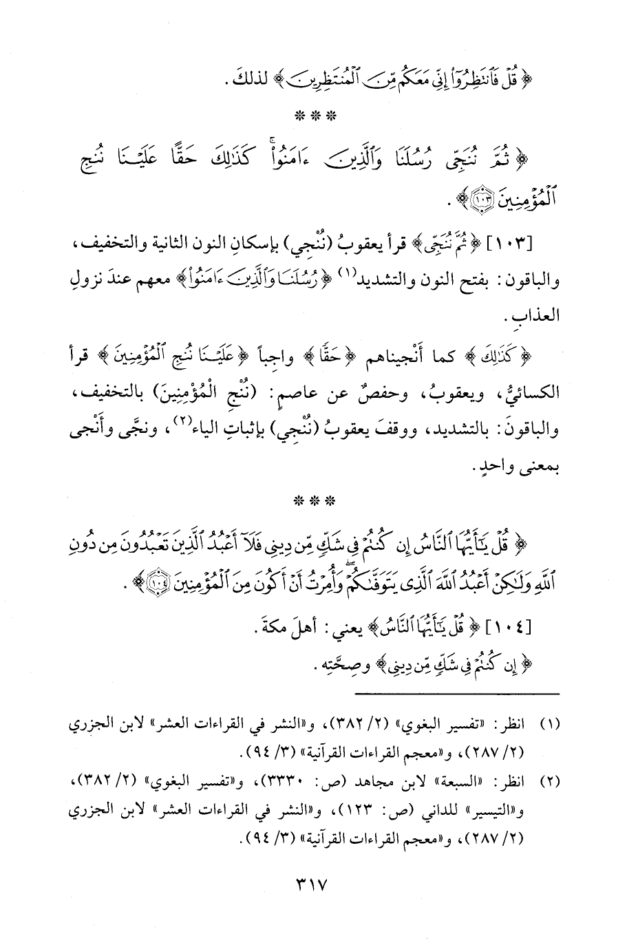 [103] {ثُمَّ نُنَجِّي} قرأ يعقوبُ (نُنجِي) بإسكانِ النون الثانية والتخفيف، والباقون: بفتح النون والتشديد (¬1) {رُسُلَنَا وَالَّذِينَ آمَنُوا} معهم عندَ نزولِ العذابِ.