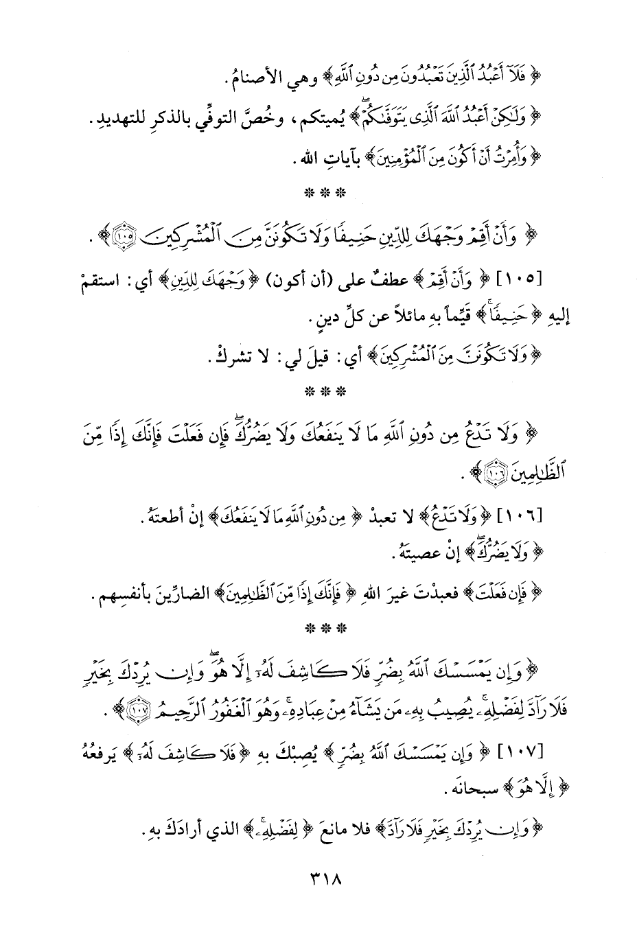{وَأَنْ أَقِمْ وَجْهَكَ لِلدِّينِ حَنِيفًا وَلَا تَكُونَنَّ مِنَ الْمُشْرِكِينَ (105)}.