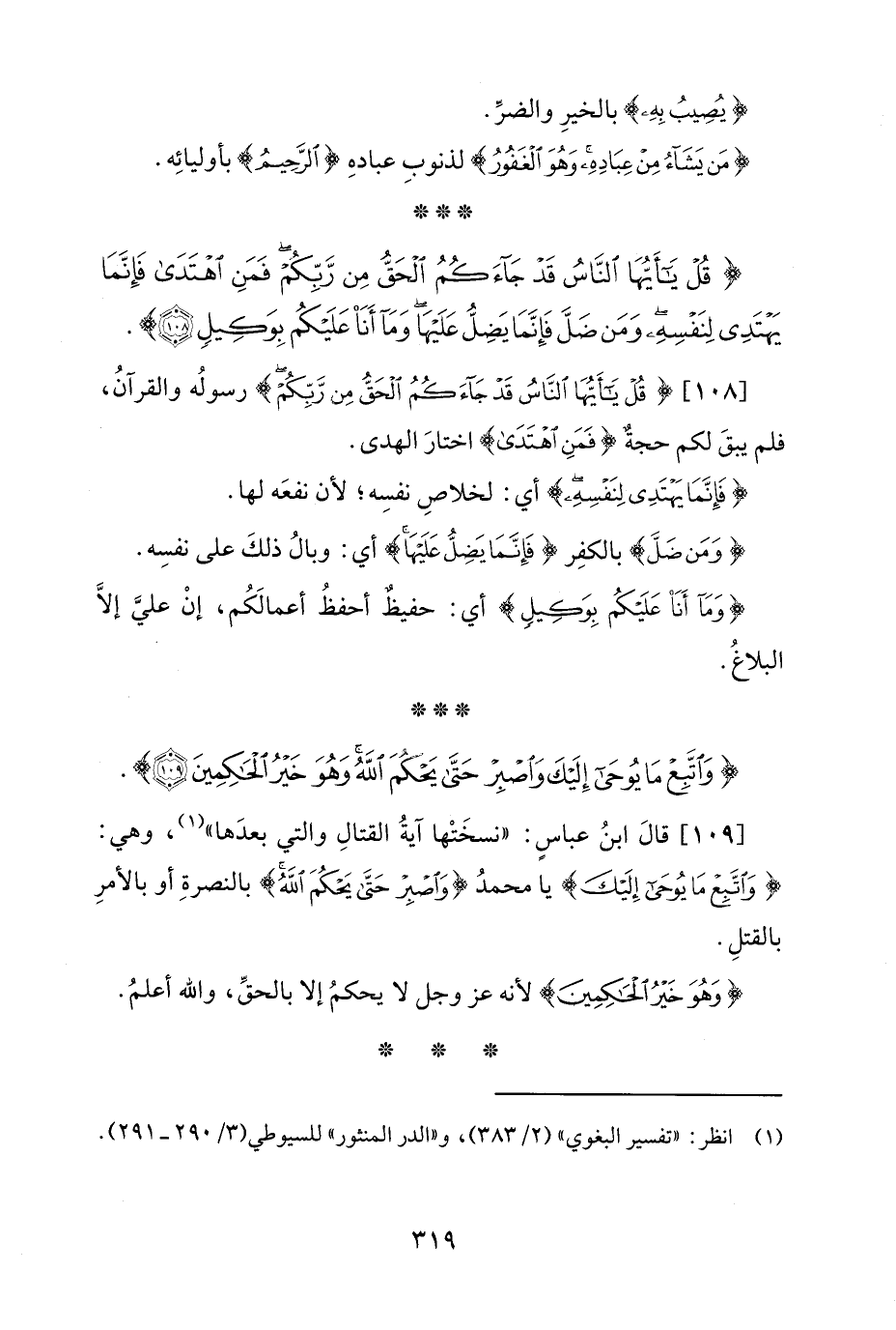 [109] قالَ ابنُ عباسٍ: "نسخَتْها آيةُ القتالِ والتي بعدَها" (¬1)، وهي: {وَاتَّبِعْ مَا يُوحَى إِلَيْكَ} يا محمدُ {وَاصْبِرْ حَتَّى يَحْكُمَ اللَّهُ} بالنصرةِ أو بالأمرِ بالقتلِ.