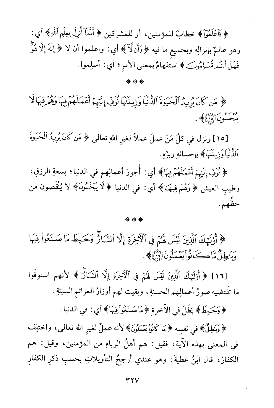 [15] ونزل في كلِّ مَنْ عملَ عملًا لغيرِ اللهِ تعالى {مَنْ كَانَ يُرِيدُ الْحَيَاةَ الدُّنْيَا وَزِينَتَهَا} بإحسانهِ وبرِّهِ.