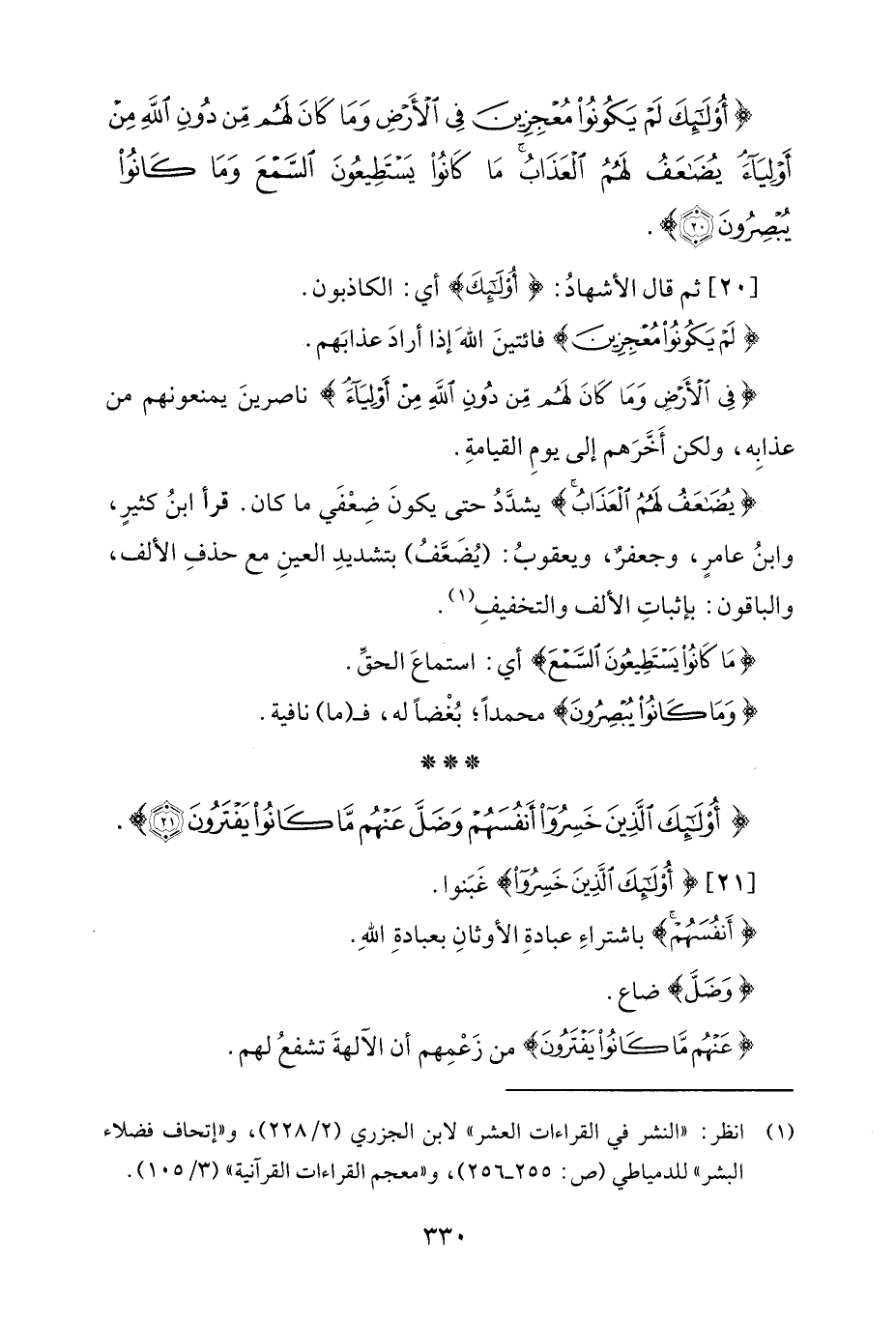 {يُضَاعَفُ لَهُمُ الْعَذَابُ} يشدَّدُ حتى يكونَ ضِعْفَي ما كان. قرأ ابنُ كثيرٍ، وابنُ عامرٍ، وجعفرٌ، ويعقوبُ: (يُضَعَّفُ) بتشديدِ العينِ مع حذفِ الألف، والباقون: بإثباتِ الألف والتخفيفِ (¬1).
